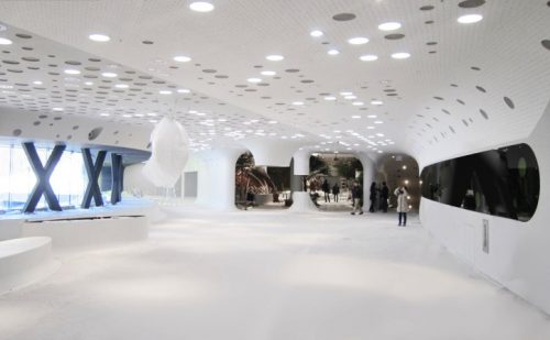 Inside, futuristic shapes, colors and textures, the museum features exhibits a continuous loop, as well as spaces for education and activities, designed as open space to recreate the scenes of the first men.