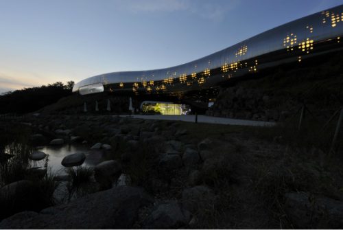 The tubular stainless steel building is buried in the ground while an external drilling pattern mimics the texture of the skin of snakes. The glossy exterior is designed to reflect the surroundings, with its colors and changes. At night the inner light shines through said perforations. Outside, the landscape has been restored to its original state as a natural park along the river.