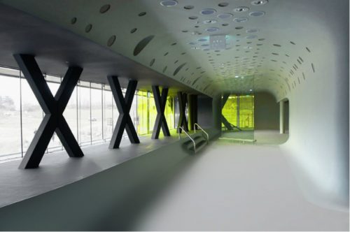 The main feature inside the museum is the “Great Walk of evolution.” Visitors follow a long line printed along the ground to guide them through the evolution of man in the region of Jeongok. Lights in motion and projections are integrated into the route to evoke a sense of participation over time. Moreover, the museum entrance and exit are at opposite ends of the building to promote a chronological and fluid experience. Externally, the flow of time It is hinted in the movement of the lights through the exterior wall of the building, including the building itself seems to flow outward like liquid metal.