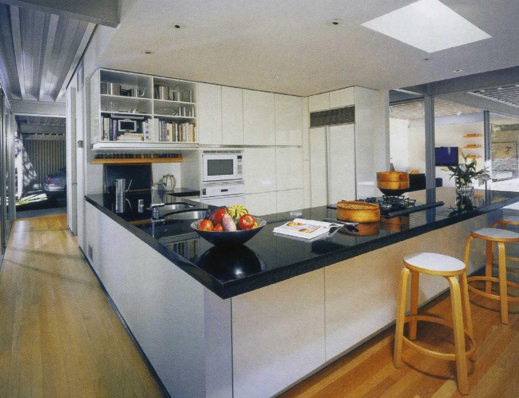 Still, in both cases, the stand-alone kitchen’s position directs the visitor to the living room and the central fireplace.