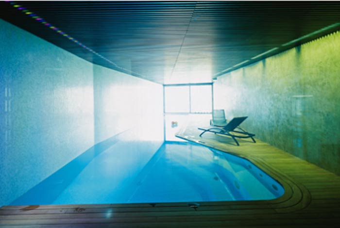 In the pool area was used as an alternative to simple colors of the interior of the house. In this area, highlighted by a lattice on the roof of black color and a golden wall, a sophisticated system of lights that range from purple to blue hues create an environment variable and appear from another dimension.