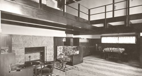 The niche where the fireplace is located is surrounded by a stone wall and Loos designed two fixed side chairs, similar to those made in the cabinet Villa Müller or corner of the Villa Moller.