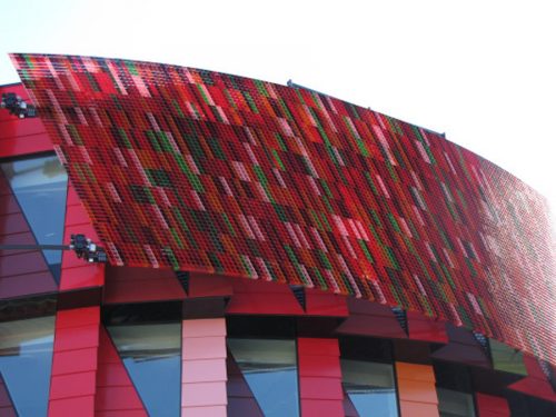 The bold reds that has finished building it a bold presence there. One, composed of a mesh-like system of photovoltaic cells, high swivel screen provides extra shade on the upper floors, as well as electricity as it moves around on the outer perimeter around the building, following the sun’s path.