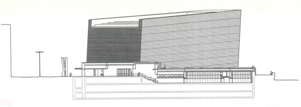 In the first of the “stranded rocks,” is the auditorium, with dimensions of 60x48x27 meters and a maximum capacity of 1,806 spectators. The room has a rectangular shape with a flat deck and around the ground floor there are the additional services: counseling, telephones, and toilets. Access to the top of the room is via ramps and stairs, made with stainless steel panels on the outside and wood on the inside. In the gap between the chambers and the housing are lobbies, which offer views of the surroundings and magnificent scenery of the beach. It also has a stage of 350 square meters equipped with camera and concert demountable stagehands, in addition to serving as a bar.