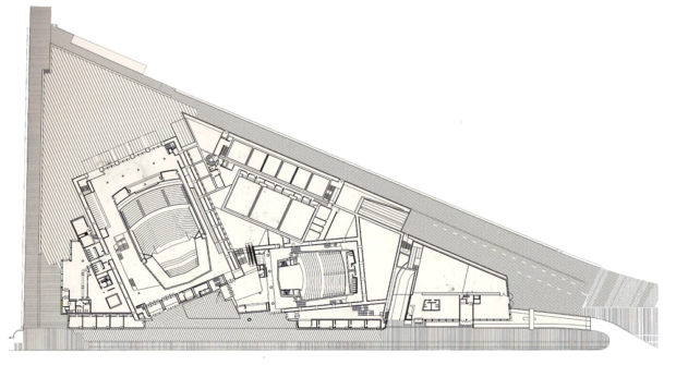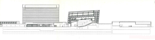 The second “rock” contains the House Chamber, consisting of a prism of 43x32x20, with a metal structure and a complimentary double wall with pieces of glass, and a capacity of 624 persons. There is also a stage of 120 square meters equipped with an acoustic ceiling and detachable stagehands.
