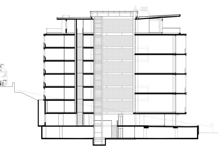 Two residential buildings were erected, with its contrafrente to rail, and the front completely open to the lake. For these new buildings, two volumes of brick and glass implanted in sloping ground and supported, at street level, in a series of concrete piles, the main architectural challenge was to break with the traditional type of single-level departments, to provide space for housing suitable proportions.