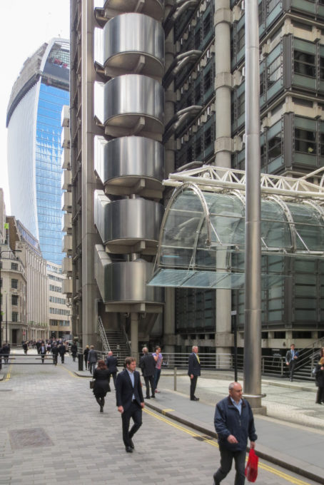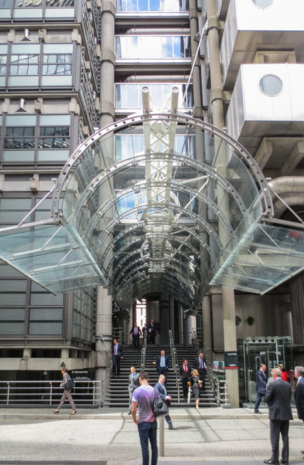 Somewhere between the “deco” and “Blade Runner” as headquarters for the company Lloyd’s of London is a surprising and risky design for an insurance company.