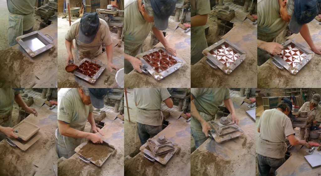For floors designed a graphic pattern on 20x20cm tablets that were manufactured with a traditional cement with mineral pigment color chocolate.