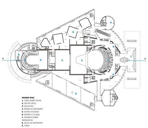 The main space center is a lyric theater for 1730 spectators, and another 450-seat multi-adaptable to different shows, from opera and dance recitals and even movies. These two rooms are the backbone of the building, located one at each end. Around the square is the lyrical drama, which is accessed by a large hall that also serves as the entrance to the complex. At the other end of the ground, next to water, is the drama that is multi-volume circular.