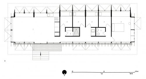 Plans Marika Alderton house are designed so that the bedrooms are located in the southwest of the house. At night the southwest corner happens to be the coolest part of the house, establishing a more comfortable sleeping arrangements. Besides providing a cooler sleep environment, platforms on which rose sleeps 2 meters above the ground so that the circulation of air below the bed is harnessed as possible. The bedrooms are 5, one principal, and 4 smaller, also ranked a sink and a shower room.