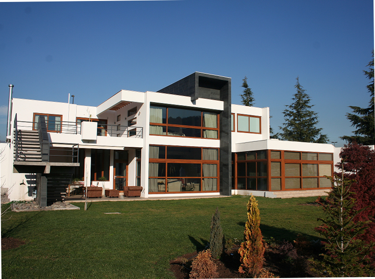 There is a combination of materials which combines concrete, the walls in white stucco, wood and stone slate, all of them with important windows with low emissivity glass, tempered and laminated.