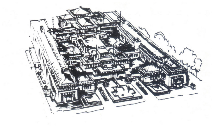 Midway Gardens was formed as a quadrilateral with sides of 183m. It was principally an outdoor entertainment facility, with a large central area on different levels, where various dining outlets could be found, and a stage in front with an orchestra or performances for the diners to enjoy.