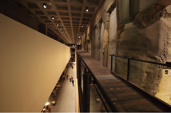 From the lobby is accessed via a spiral staircase that descends 17 meters underground at the lowest level of the three that make up the museum. The staircase is flanked by a wall of glass and steel on one side and the golden sandstone other. You can also use the glass elevator.