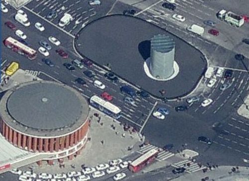 The cylinder of 11 meters in height is located next to the entrance of the Avenue of the Atocha station, at the confluence of the Paseo de la Infanta Isabel, Avenida Ciudad de Barcelona Alfonso XII and the street in Madrid.
