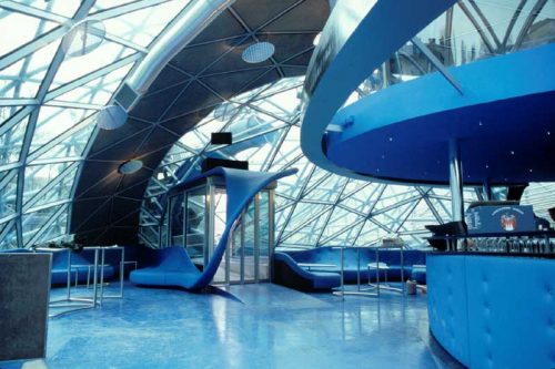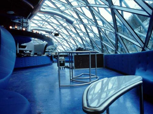 At its closed and under the vaulted glass ceiling of the dome there is a blue and white coffee, where people can enjoy the terrace on the top or the restaurant-cafe downstairs. Flexible triangular and curved seats can be moved into the space to allow for different configurations.