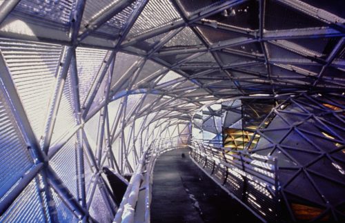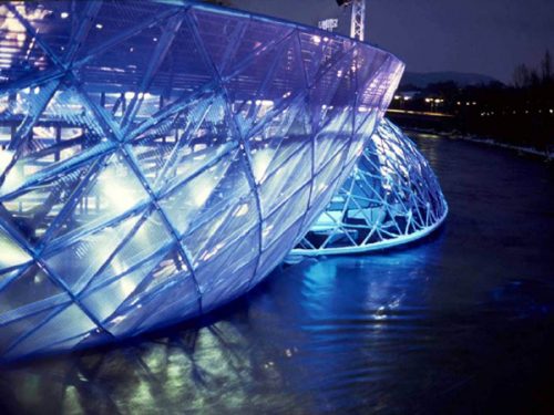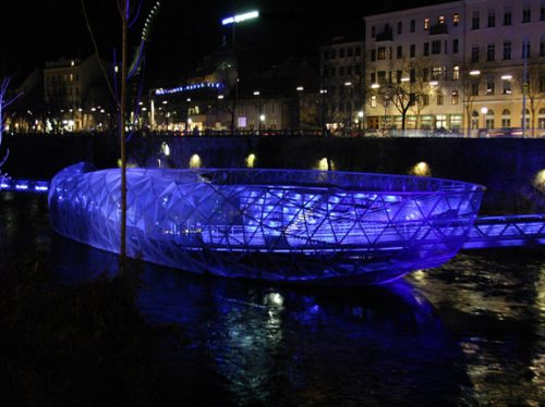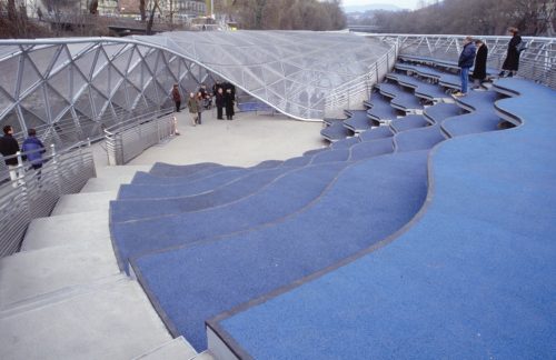 The pedestrian bridge designed by artist Vito Acconci, who also dedicated to architectural projects, was inaugurated in 2003 on the river Mur. Known as Mur Island Bridge or Aiola Island Bridge involved the creation of an artificial island accessible on a floating platform on the river, as part of preparations for the appointment of Graz as European Capital of Culture 2003.