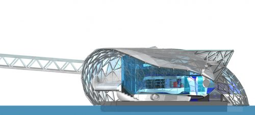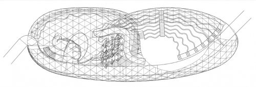 The island, which is connected by walkways and ramps to both banks of the river, creating torsion in two zones of activity which function as two halves of an open shell, revealing aside the open environment of the housing and the other a closed dome.