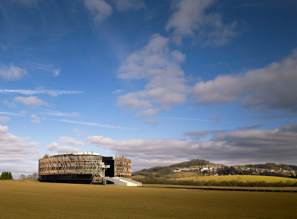 Bernard Tschumi has created a counseling center circular concrete wrapped in a wooden lattice that evokes the Roman fortifications.