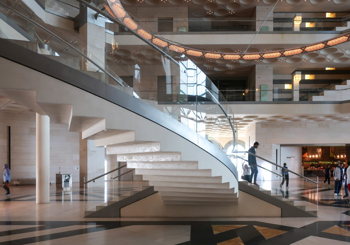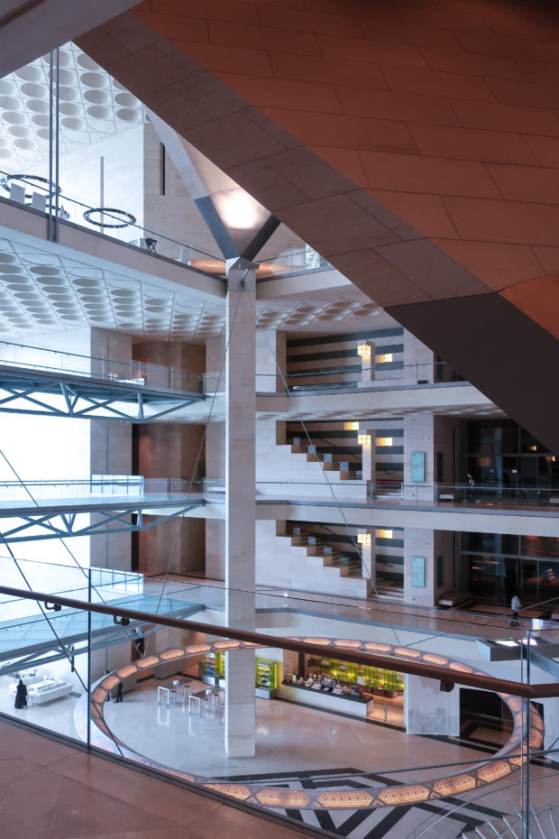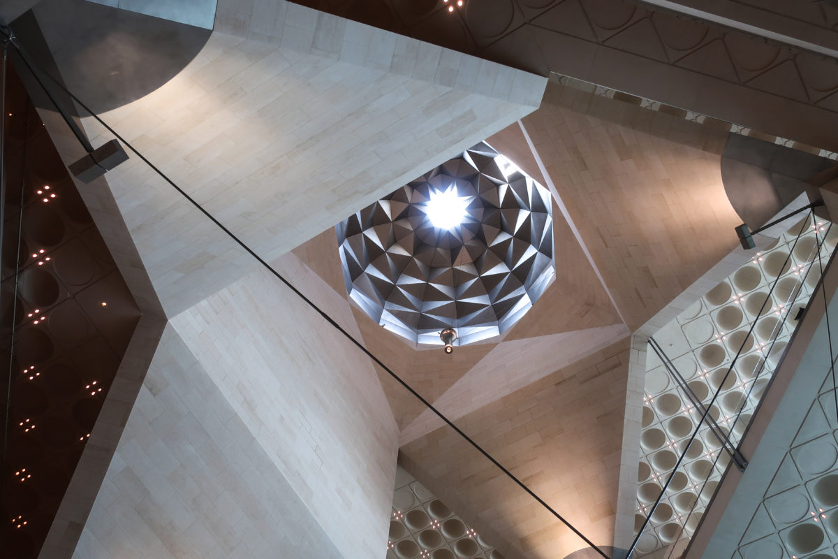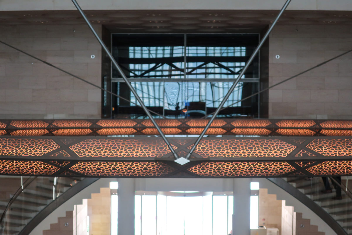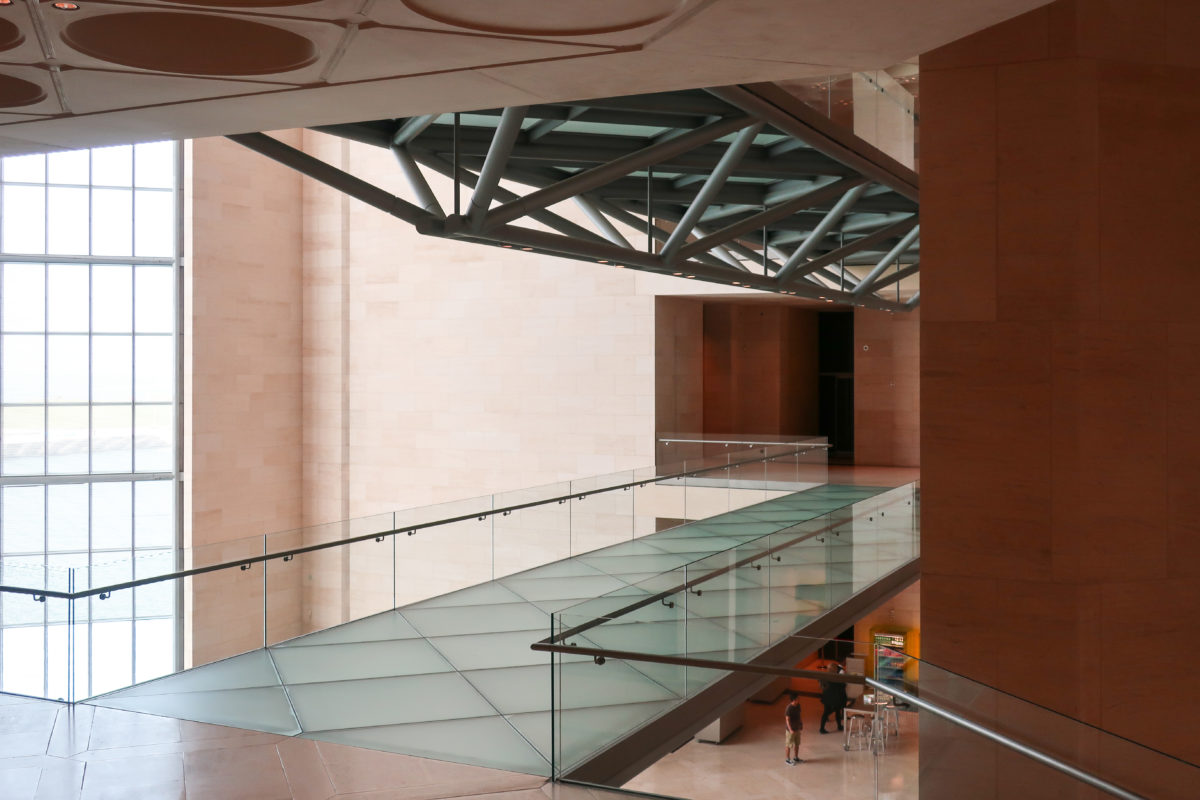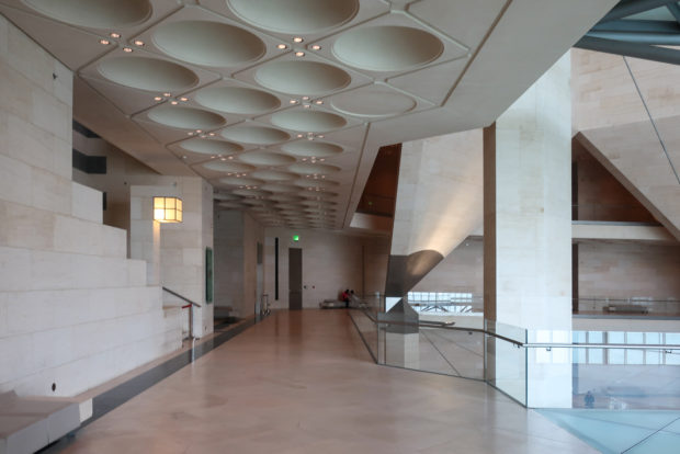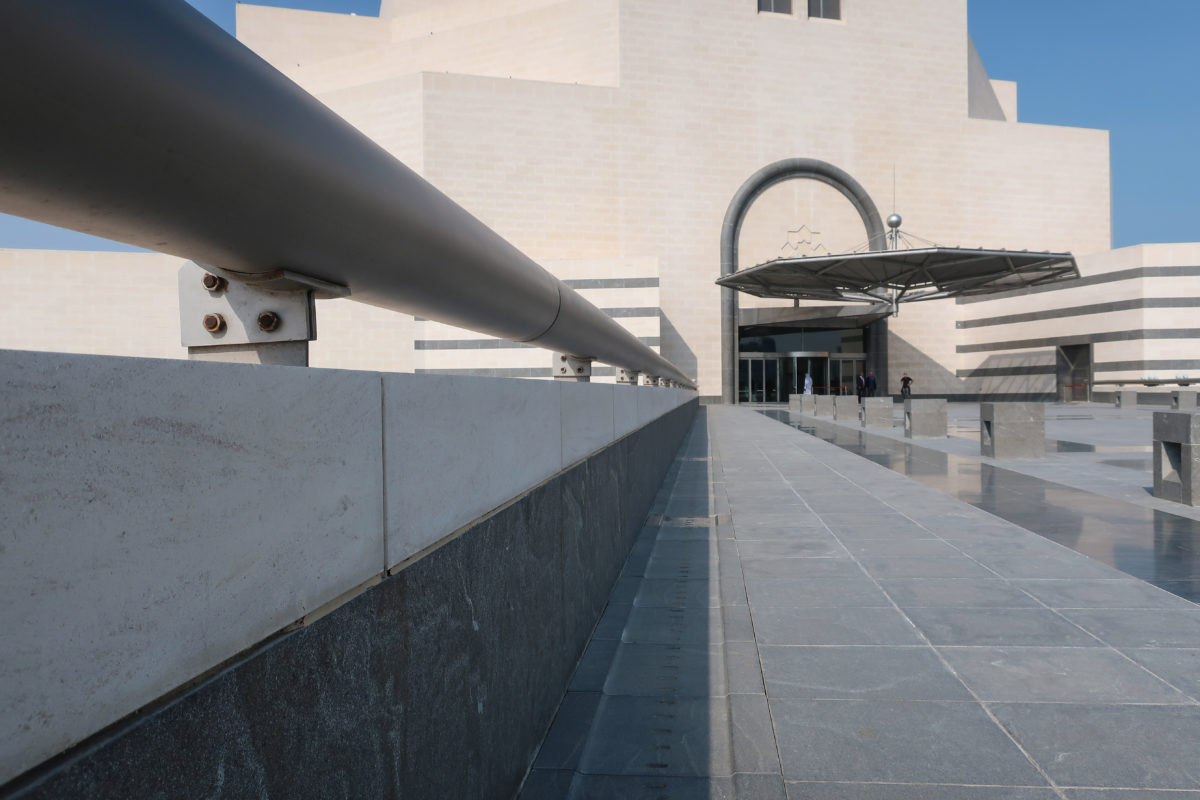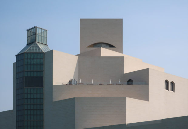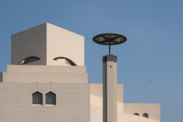 Dedicated to reflect the vitality, complexity and diversity of the arts of the Islamic world, the Museum of Islamic Art collects, preserves, studies and exhibits masterpieces that span three continents from the seventh to the nineteenth centuries. The austerity of the exterior of the Museum contrasts with the use of decorative patterns and shapes used by Pei inside the building. Apart from the more elaborate metal canopy of the entrance, the building is essentially flat.