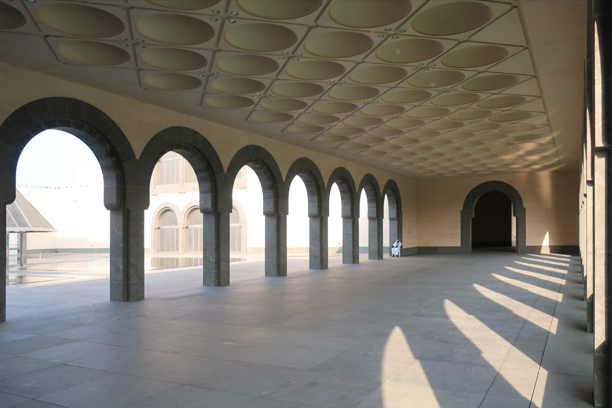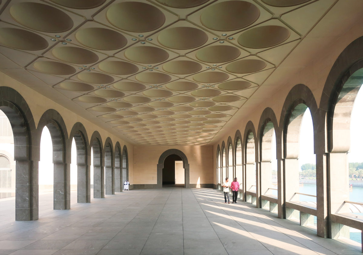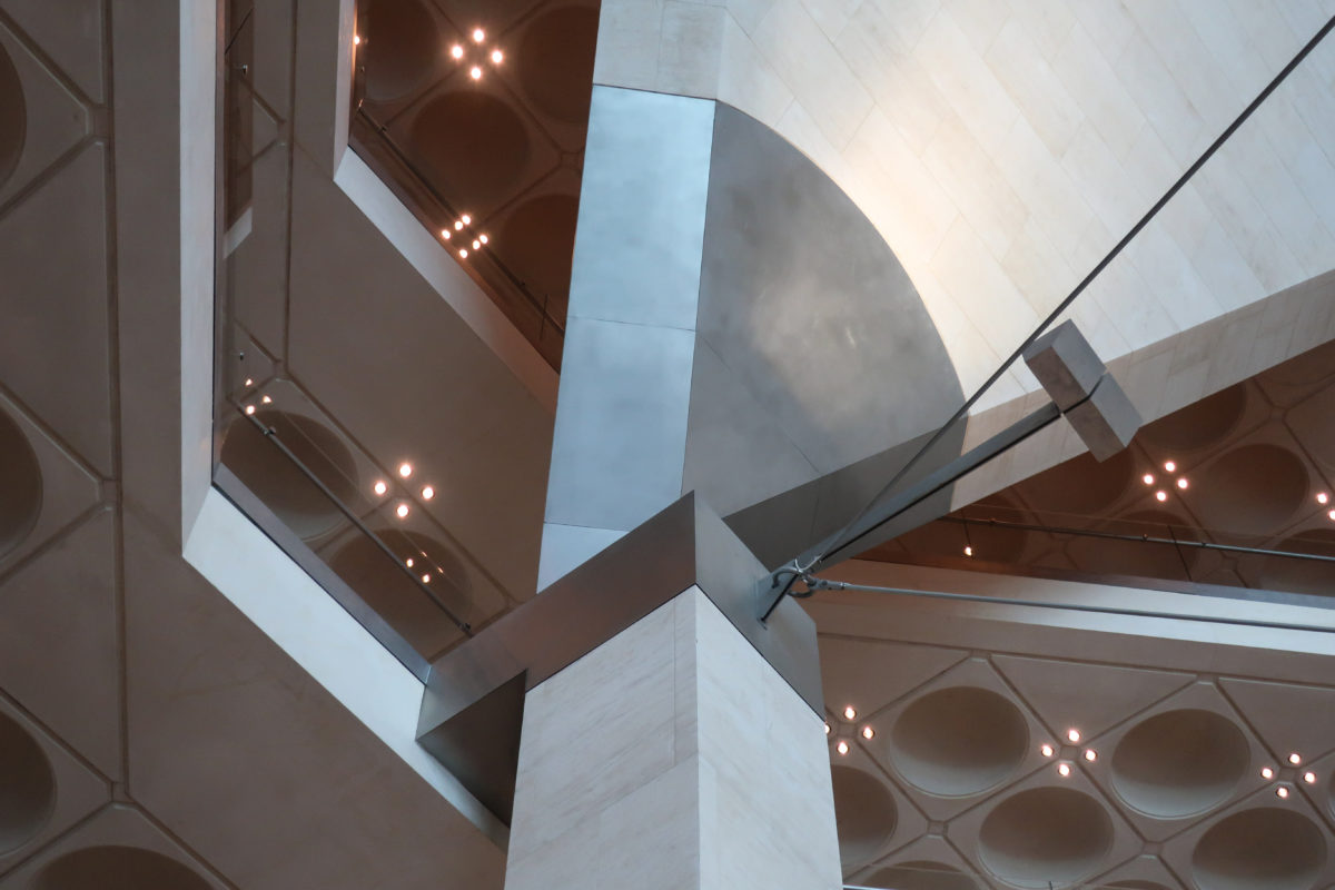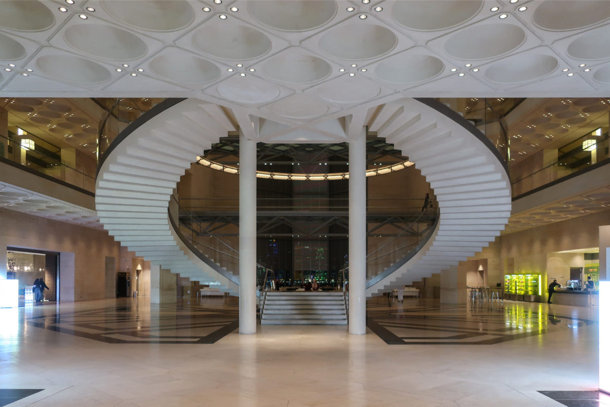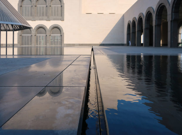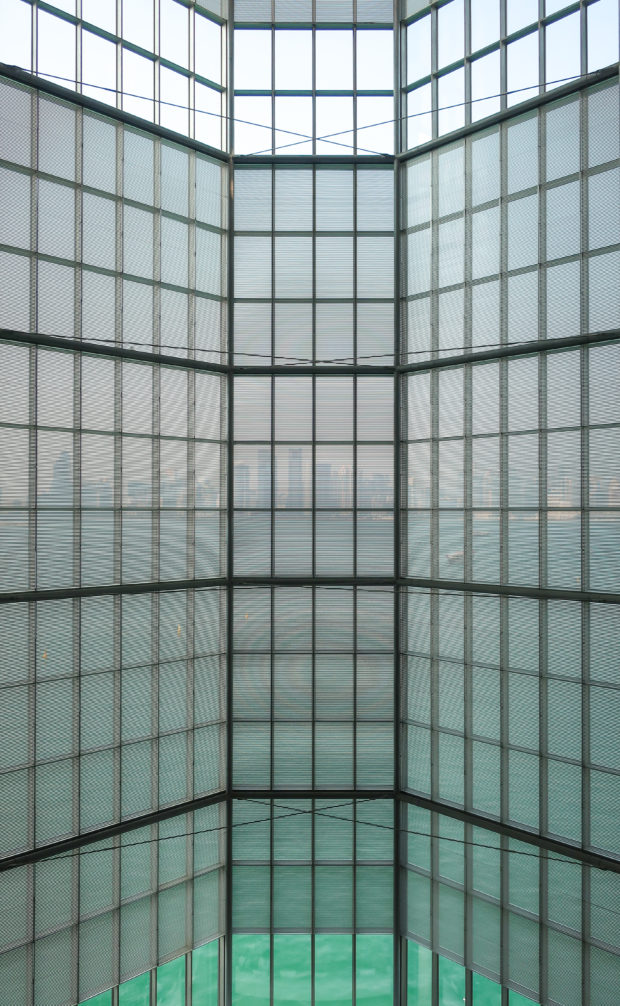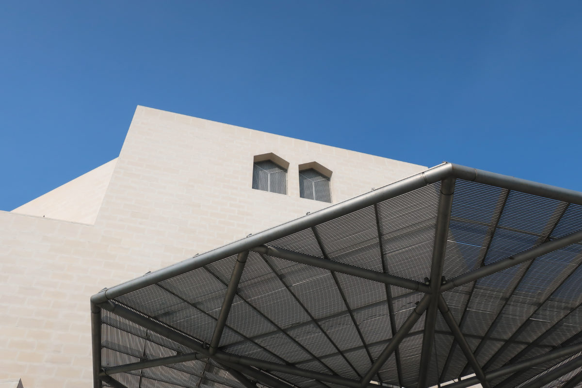 Dedicated to reflect the vitality, complexity and diversity of the arts of the Islamic world, the Museum of Islamic Art collects, preserves, studies and exhibits masterpieces that span three continents from the seventh to the nineteenth centuries. The austerity of the exterior of the Museum contrasts with the use of decorative patterns and shapes used by Pei inside the building. Apart from the more elaborate metal canopy of the entrance, the building is essentially flat.