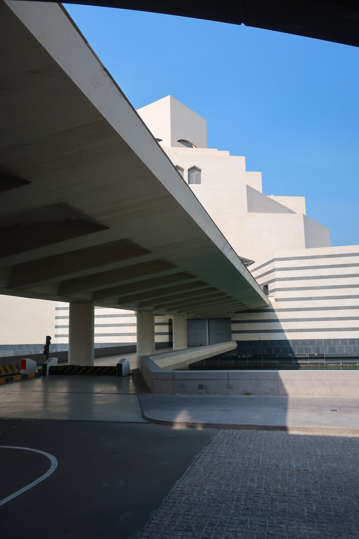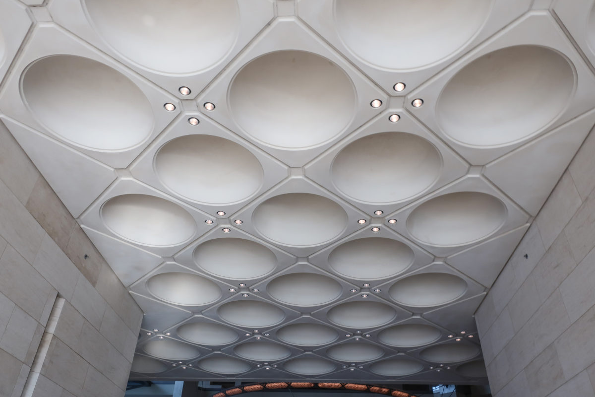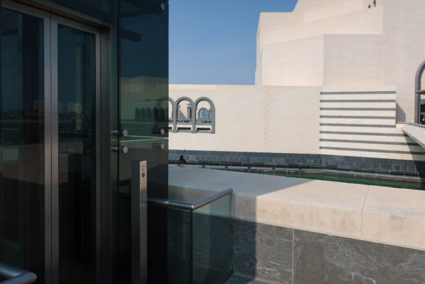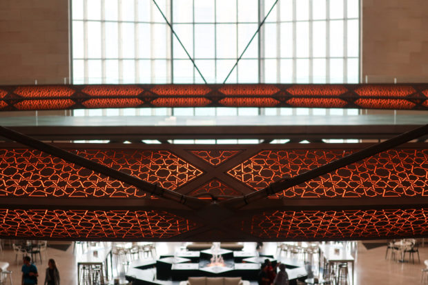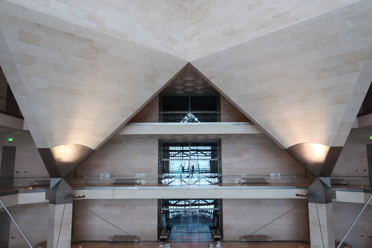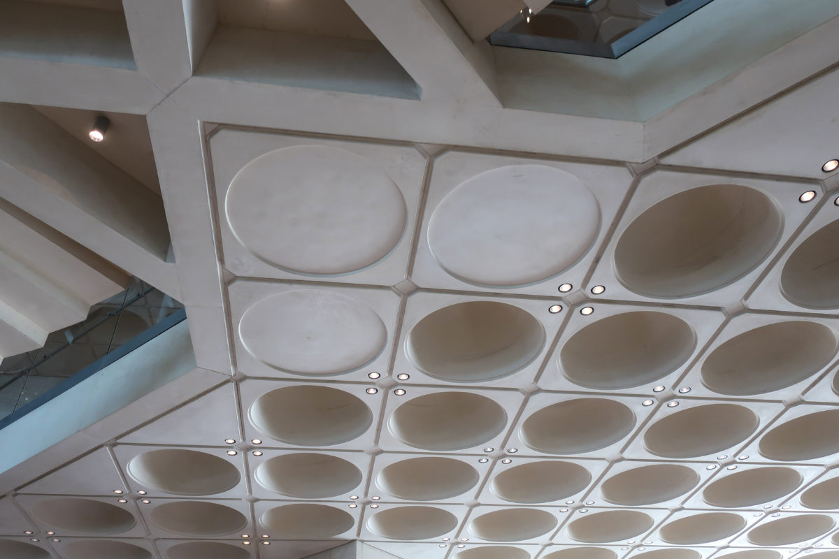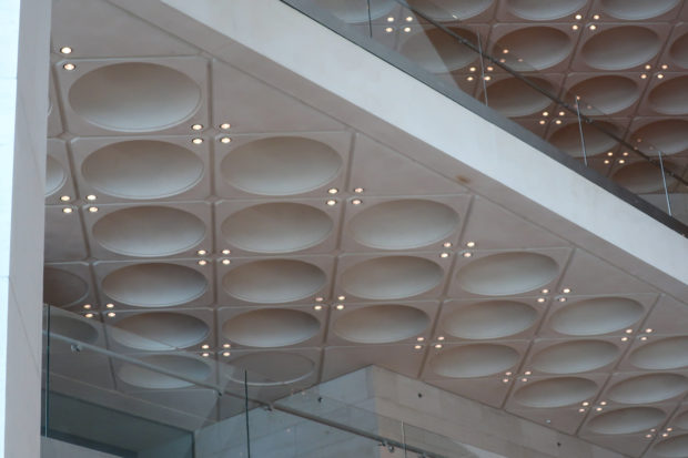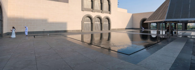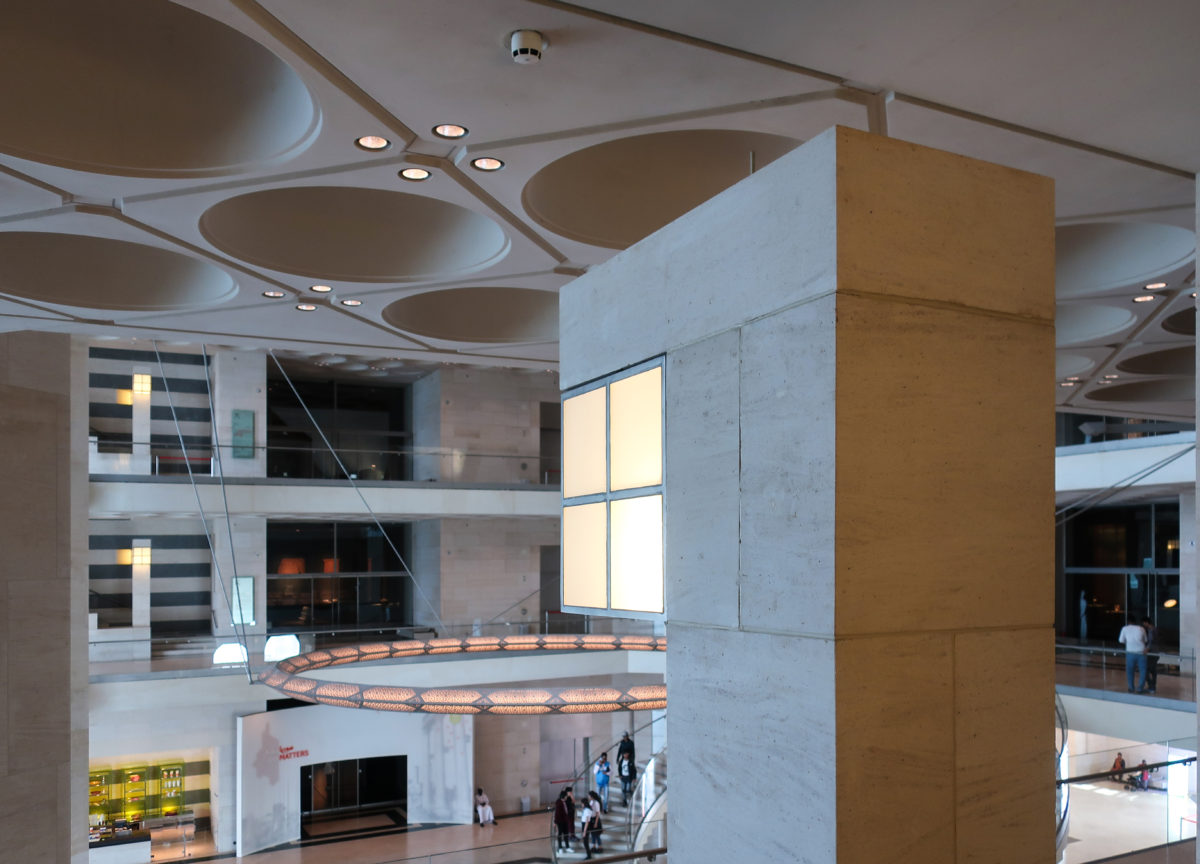 Dedicated to reflect the vitality, complexity and diversity of the arts of the Islamic world, the Museum of Islamic Art collects, preserves, studies and exhibits masterpieces that span three continents from the seventh to the nineteenth centuries. The austerity of the exterior of the Museum contrasts with the use of decorative patterns and shapes used by Pei inside the building. Apart from the more elaborate metal canopy of the entrance, the building is essentially flat.