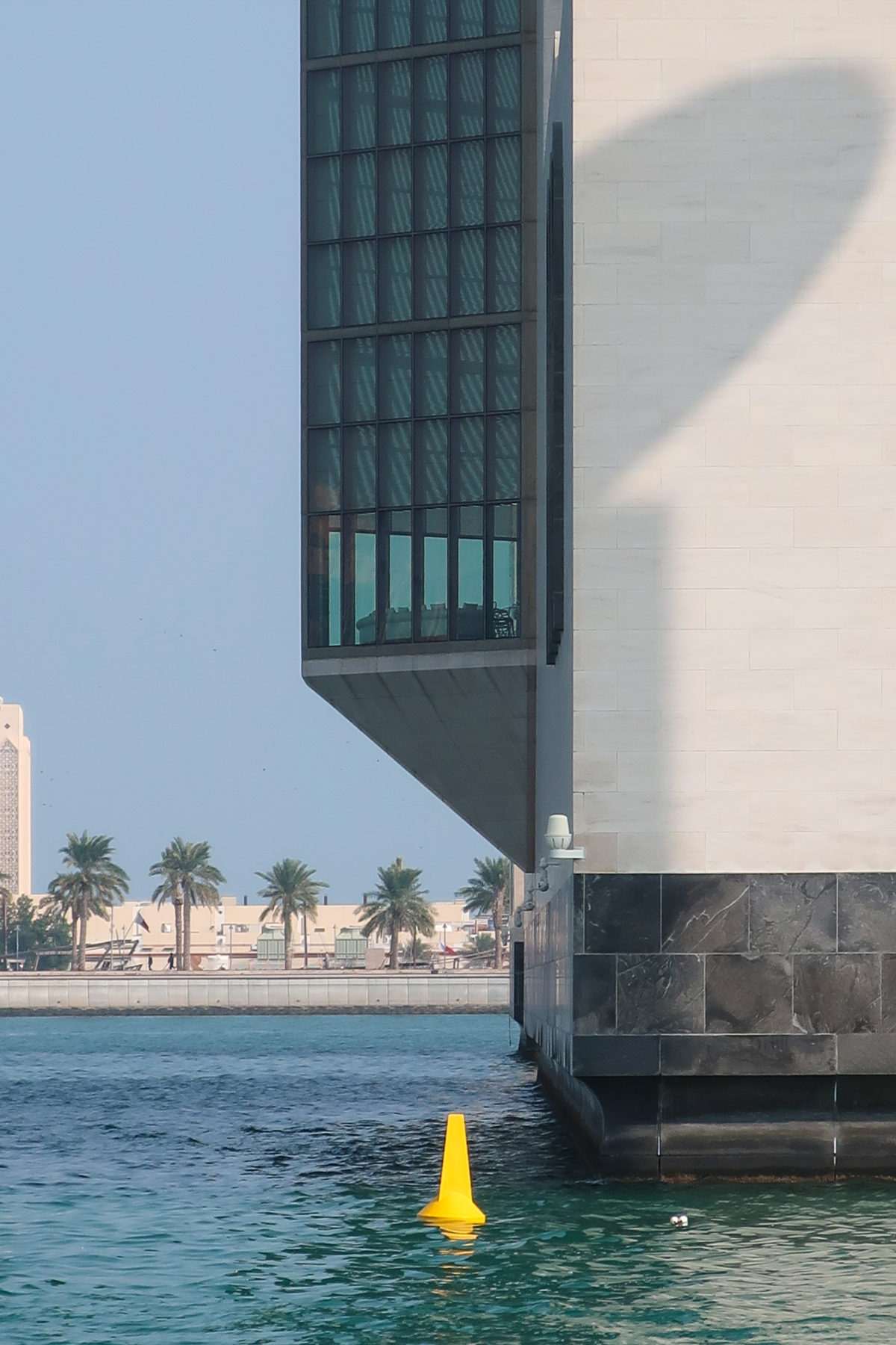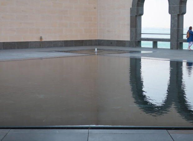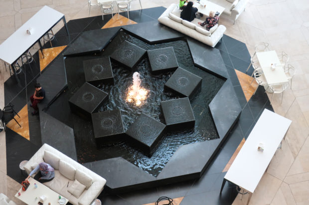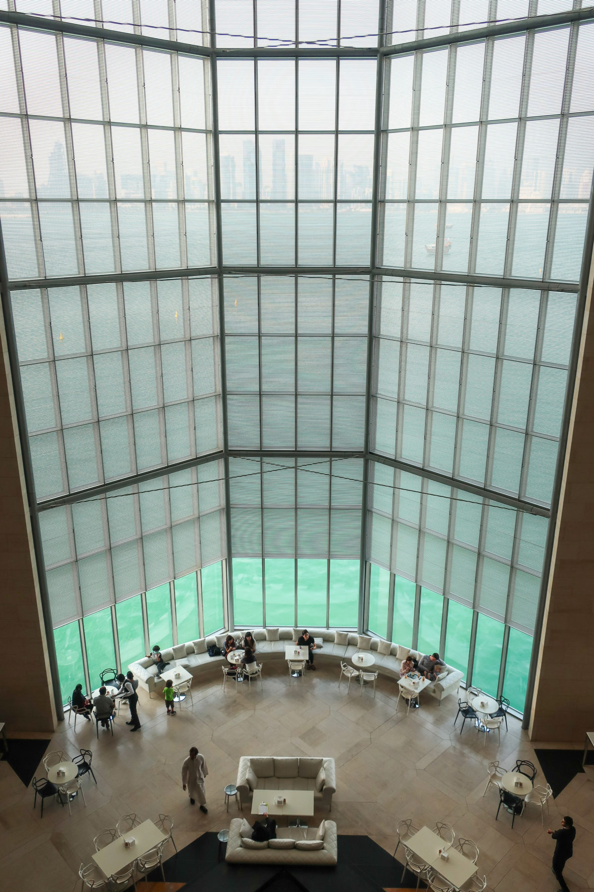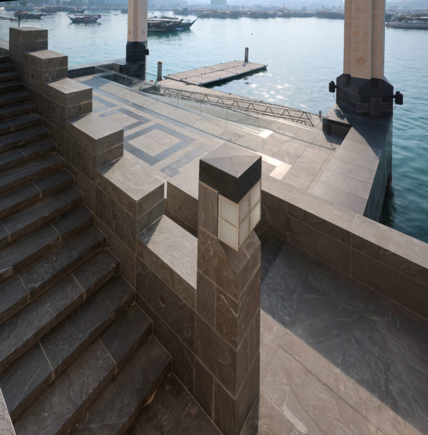 On the opposite side of the entrance, the north side of the museum, stands the only main window, a 45m high glass curtain wall that offers panoramic views of the Gulf and the West Bay area of Doha. This glazed wall can be seen through a sculptural double staircase specially designed to highlight the effect of light and the growing horizon of the new city towers. In this part of the atrium are the restaurant cafe tables, set by the sound of the water that flows from a particular octagonal black marble fountain.