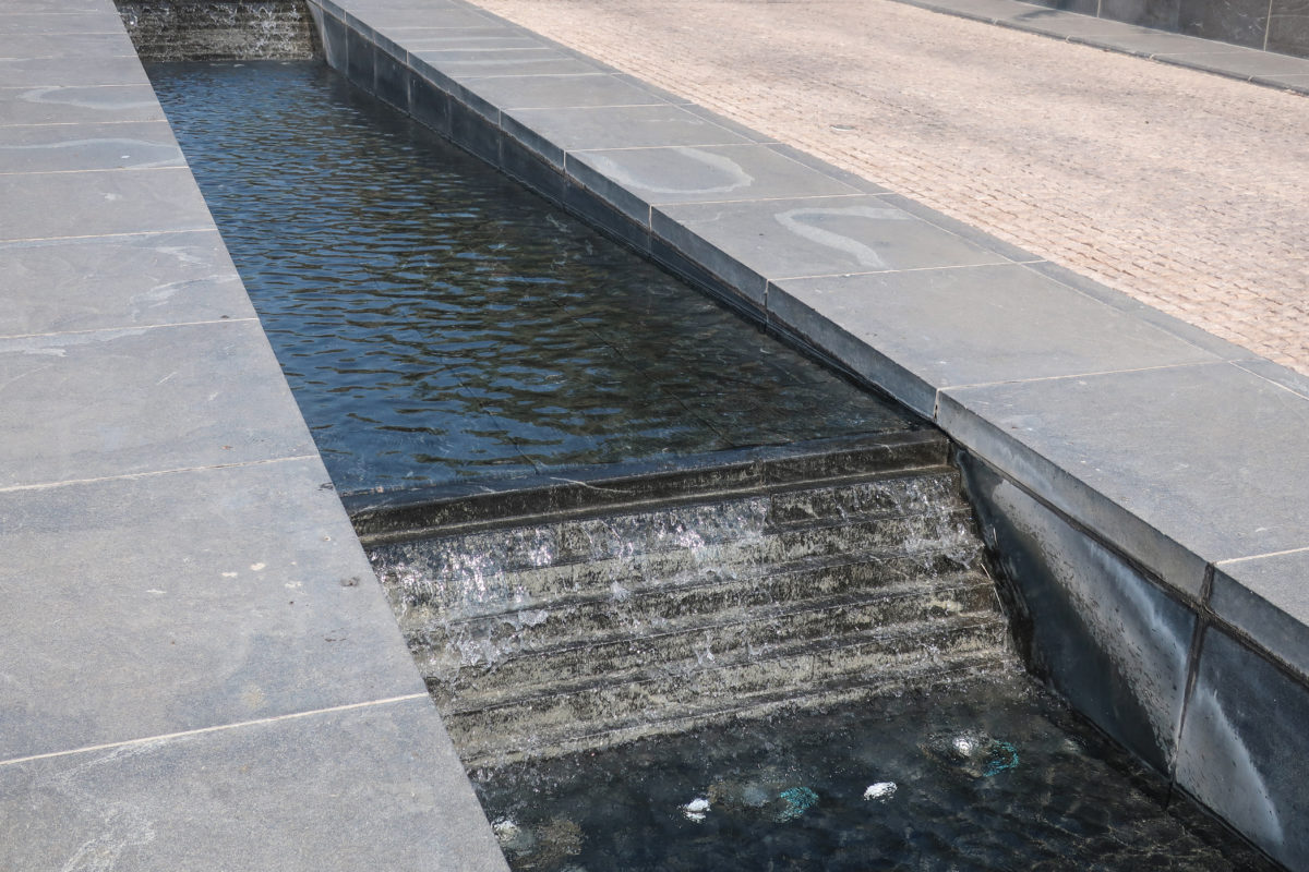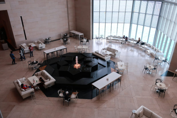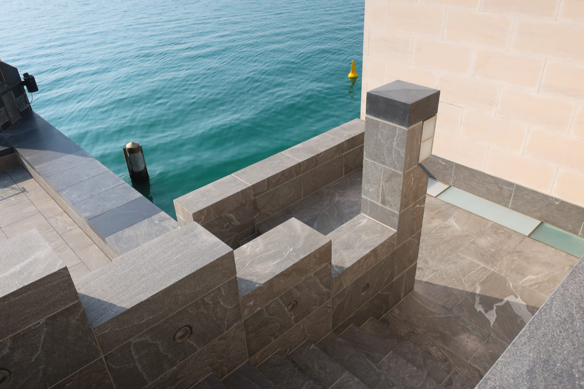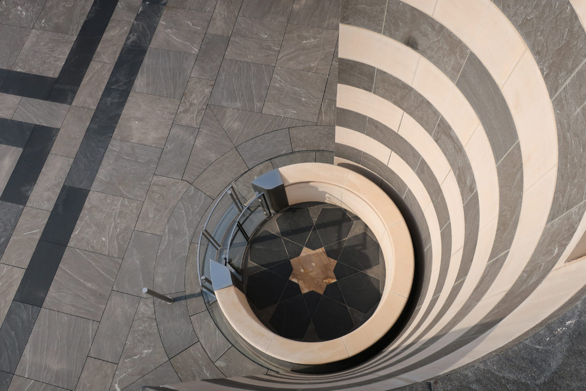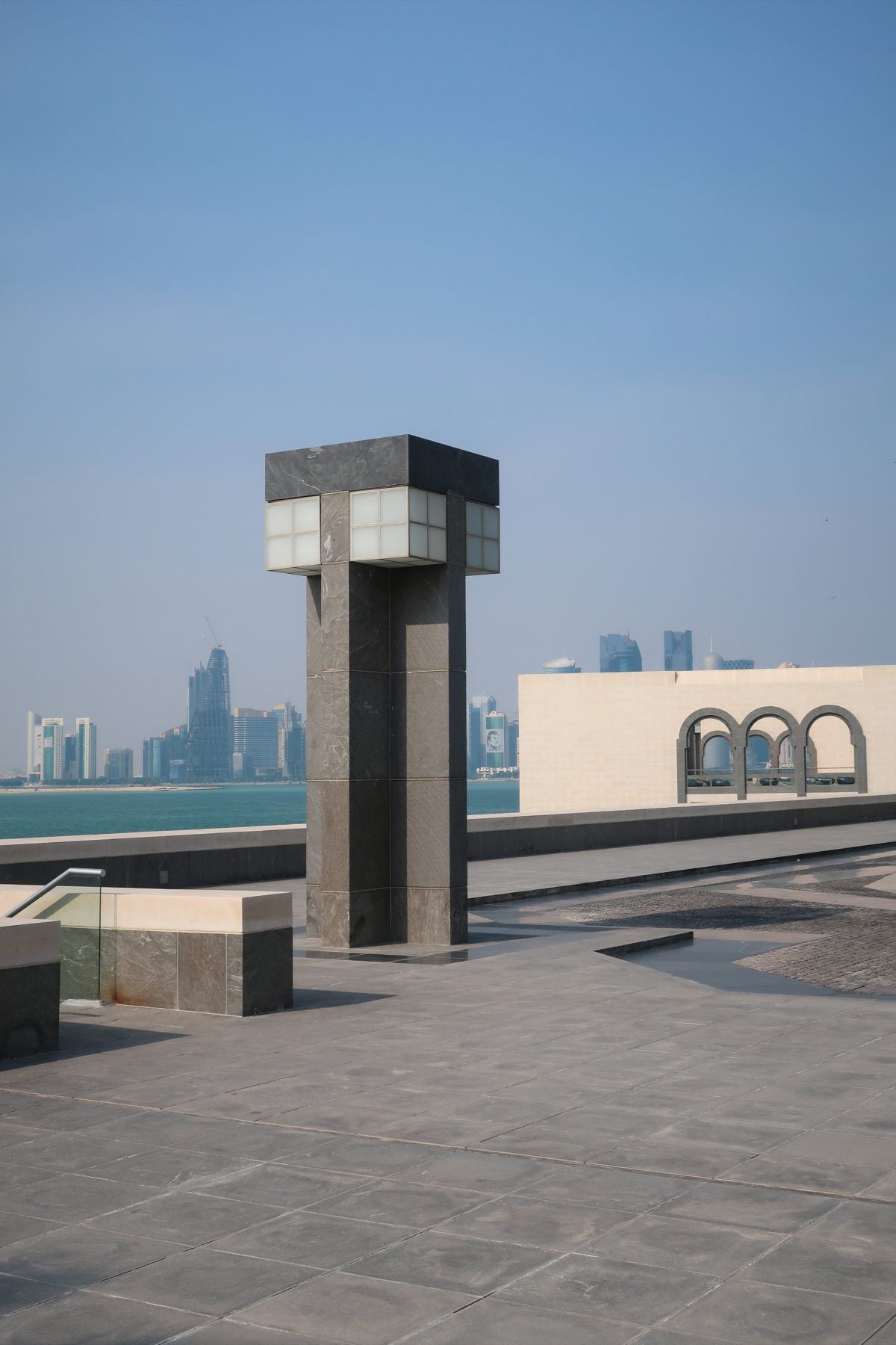 On the opposite side of the entrance, the north side of the museum, stands the only main window, a 45m high glass curtain wall that offers panoramic views of the Gulf and the West Bay area of Doha. This glazed wall can be seen through a sculptural double staircase specially designed to highlight the effect of light and the growing horizon of the new city towers. In this part of the atrium are the restaurant cafe tables, set by the sound of the water that flows from a particular octagonal black marble fountain.