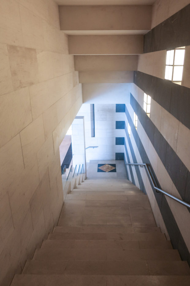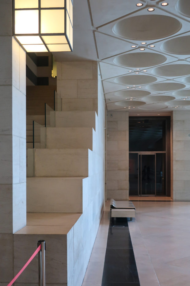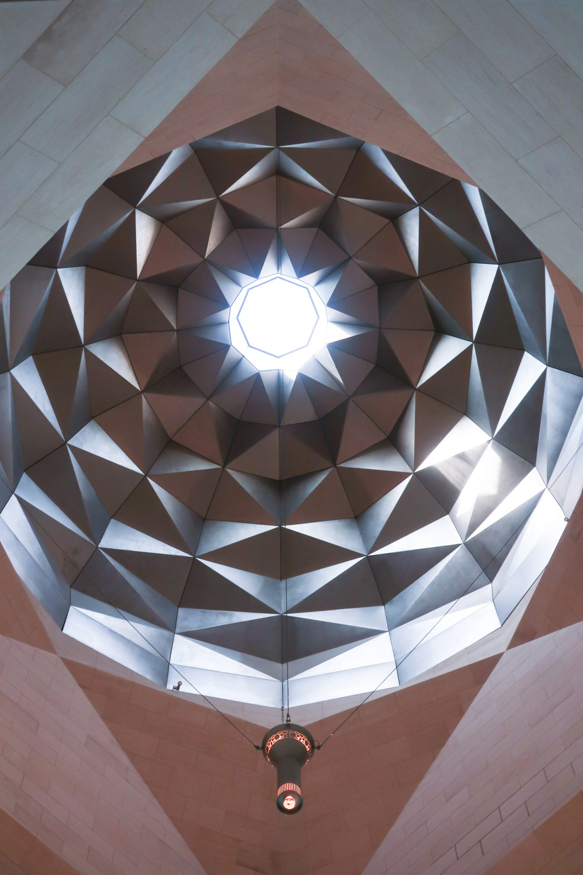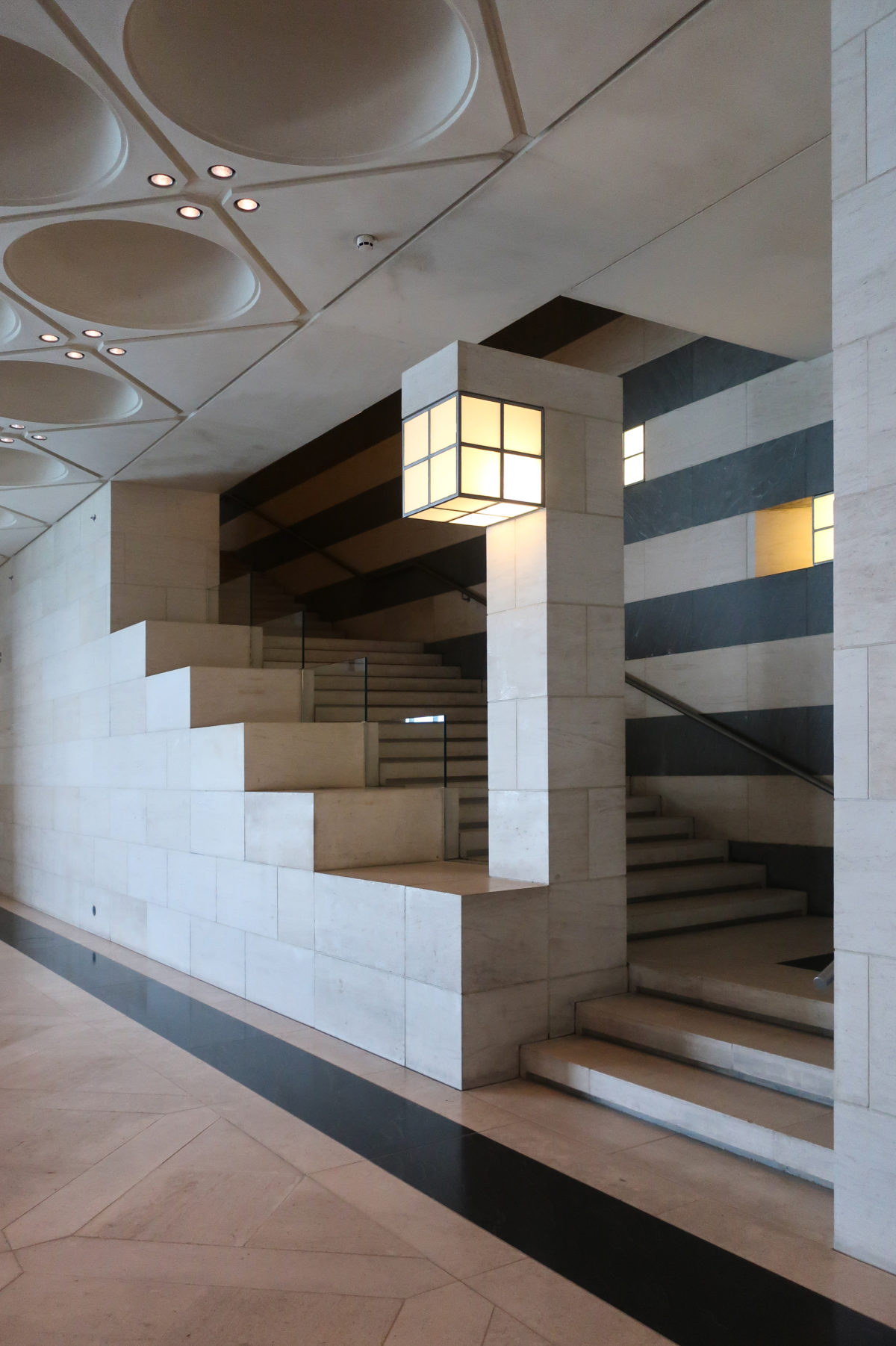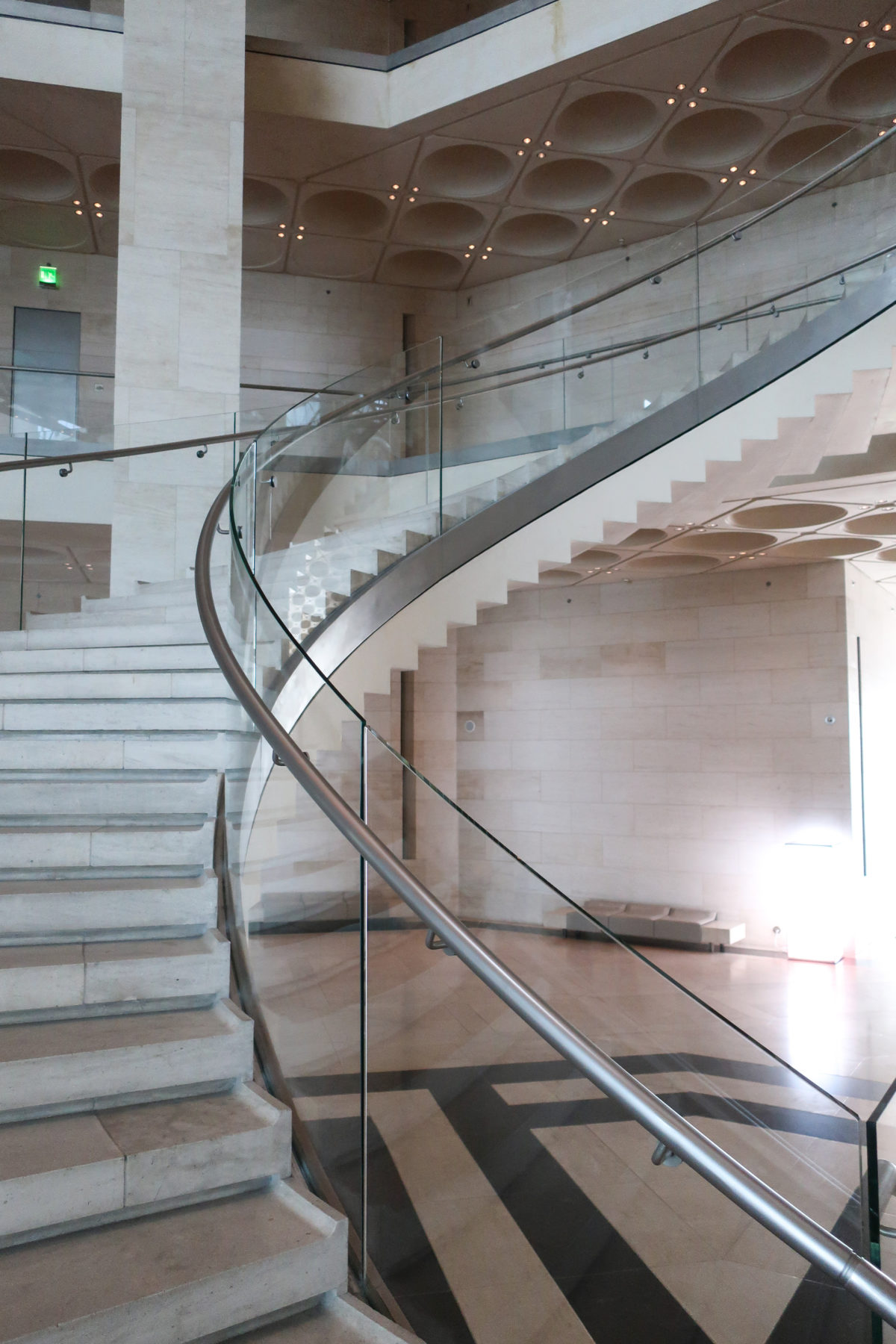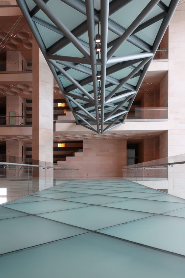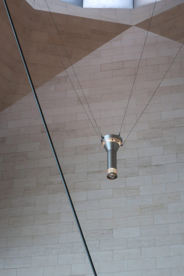 The angular volumes of the main building recede as they rise around a 50m high vaulted atrium, designed by Pei and hidden from the outside by the walls of a central tower. An ovule, at the top of the atrium, captures and reflects a pattern of molded light from within a faceted dome, allowing the rays of light to move along its surface, giving life and movement to the space below. On the beginning of the stairs, under the dome, hangs a spectacular and tubular circular chandelier with a diameter of 12m,