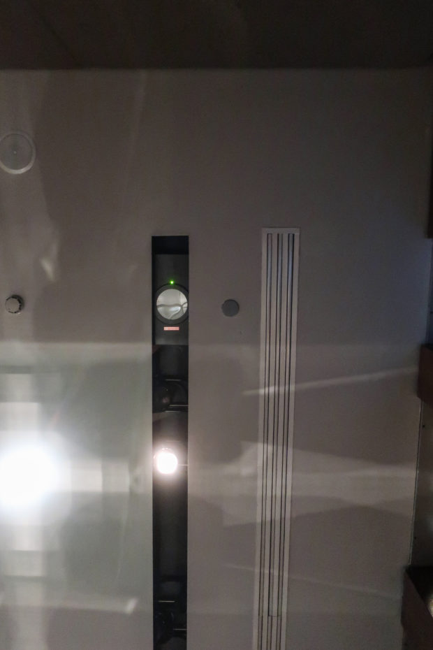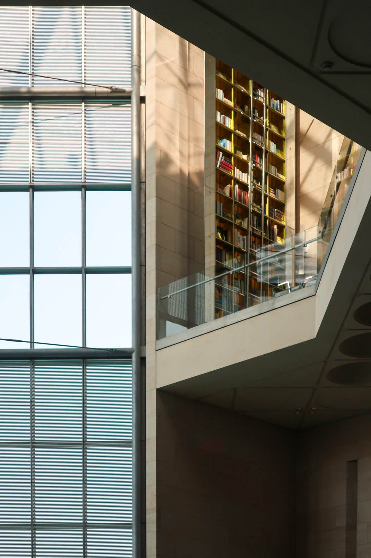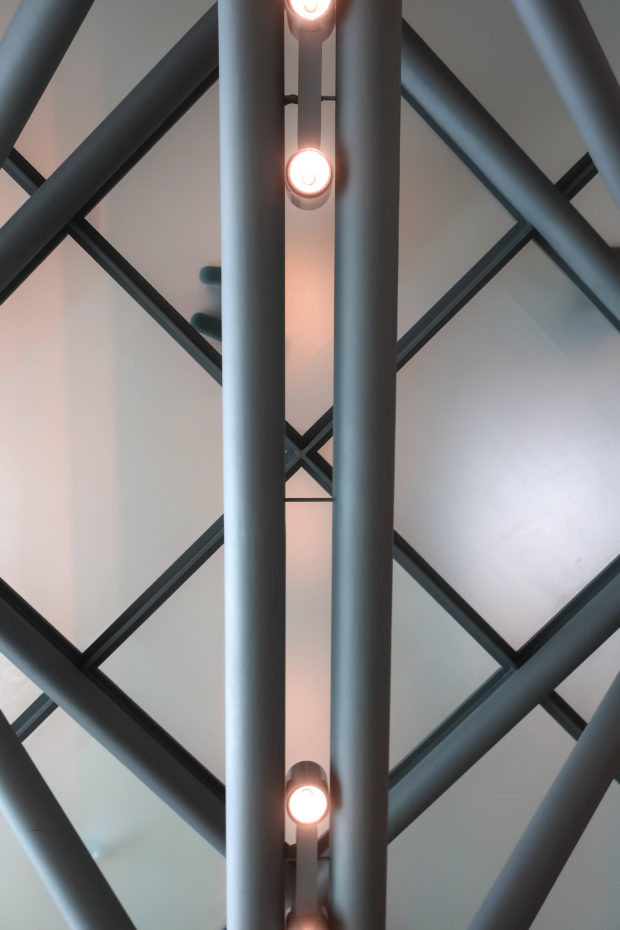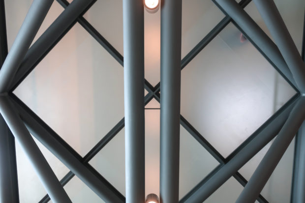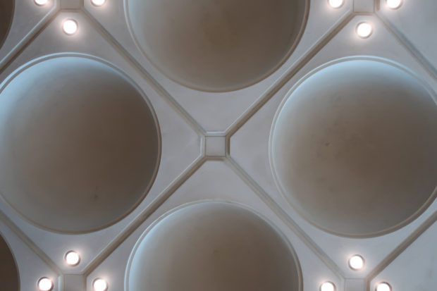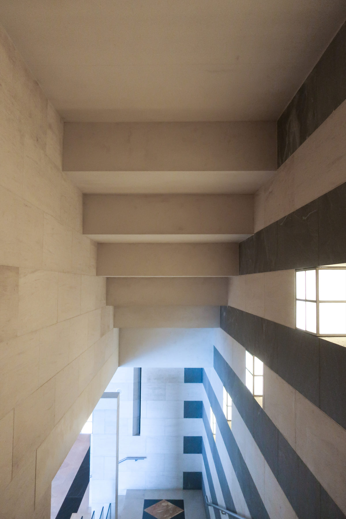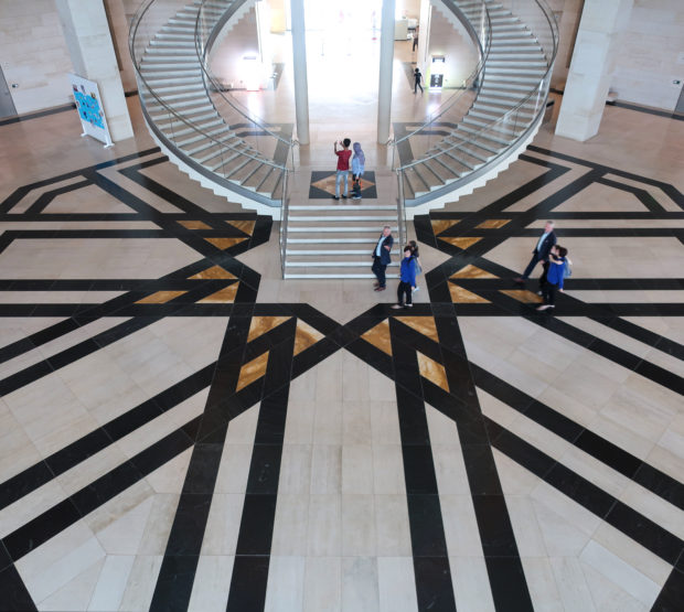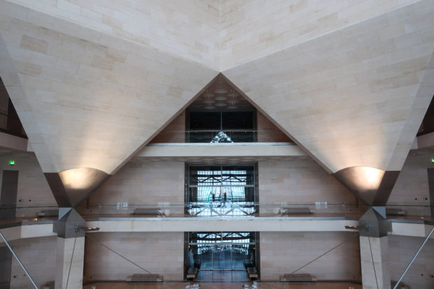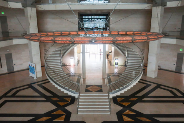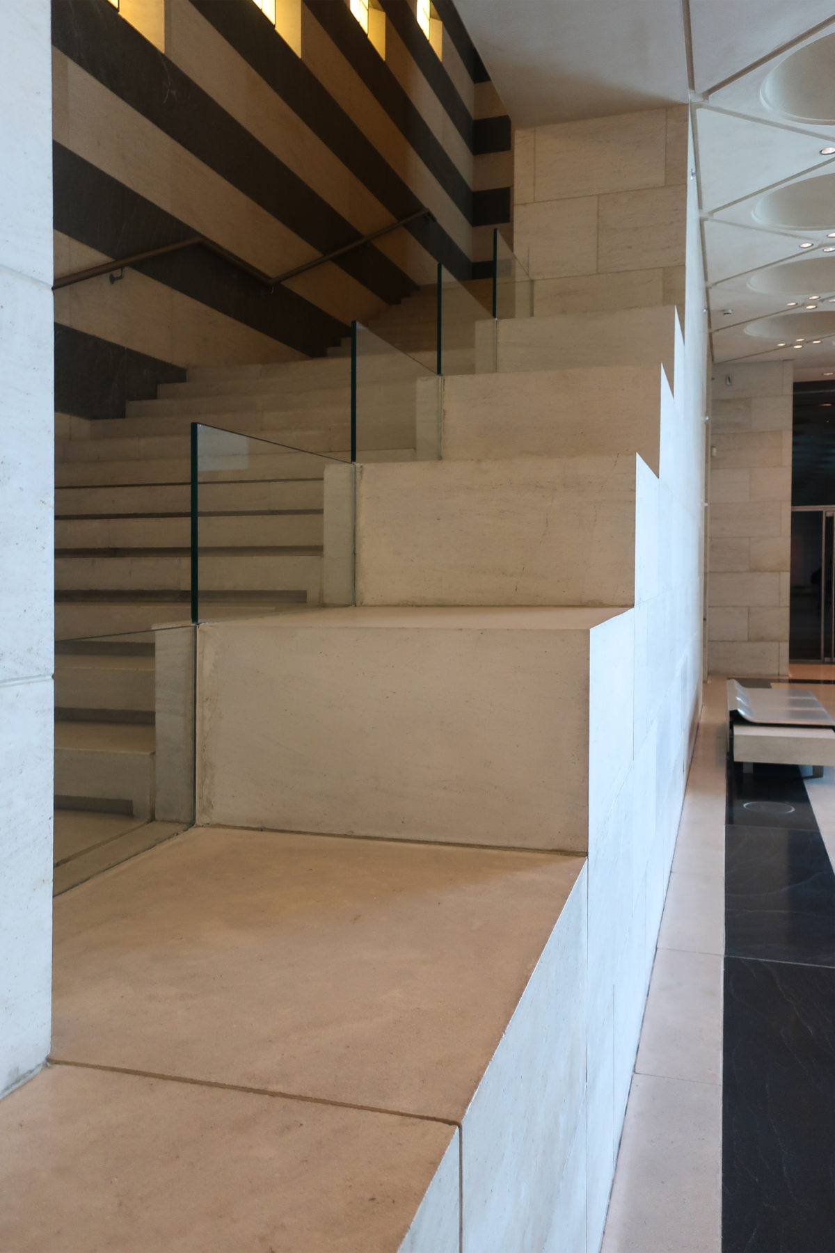 The angular volumes of the main building recede as they rise around a 50m high vaulted atrium, designed by Pei and hidden from the outside by the walls of a central tower. An ovule, at the top of the atrium, captures and reflects a pattern of molded light from within a faceted dome, allowing the rays of light to move along its surface, giving life and movement to the space below. On the beginning of the stairs, under the dome, hangs a spectacular and tubular circular chandelier with a diameter of 12m,