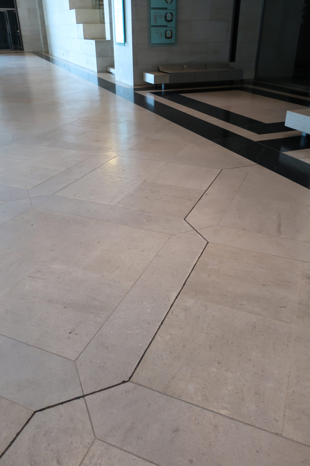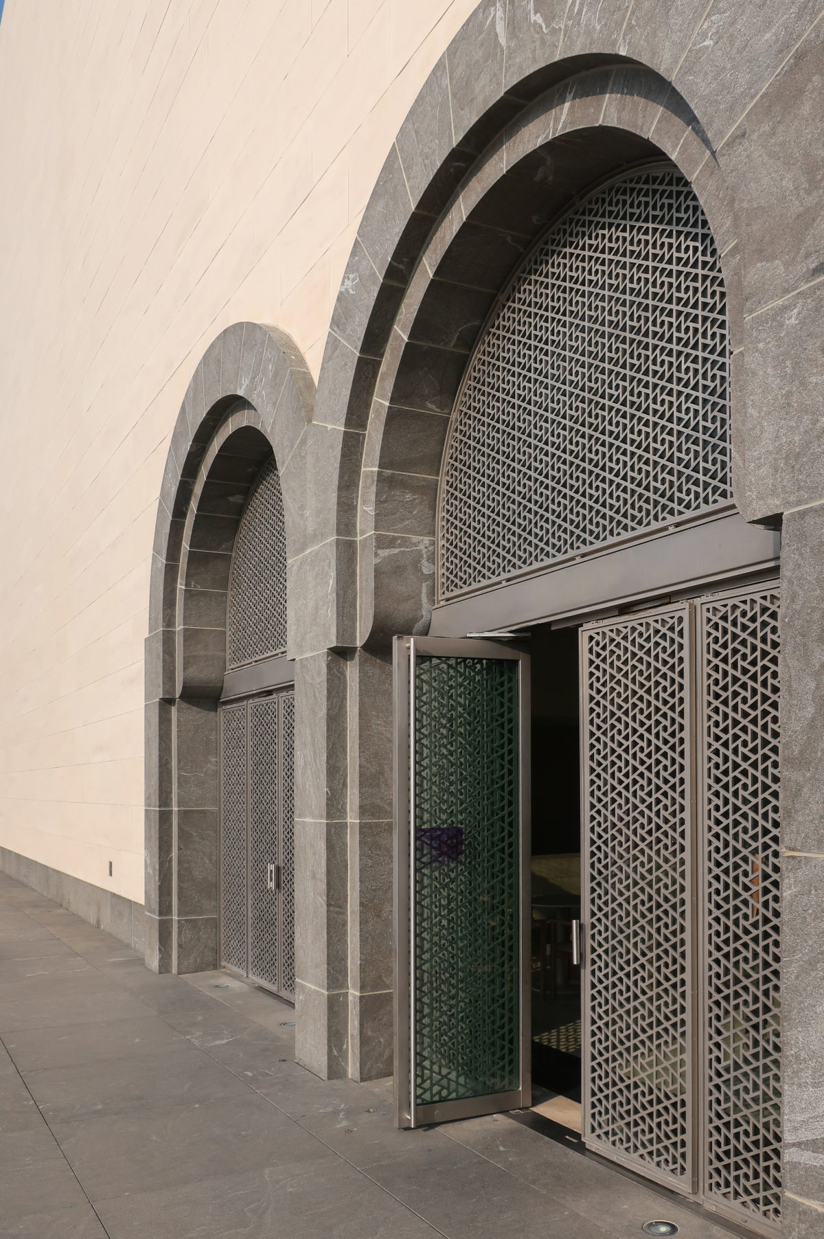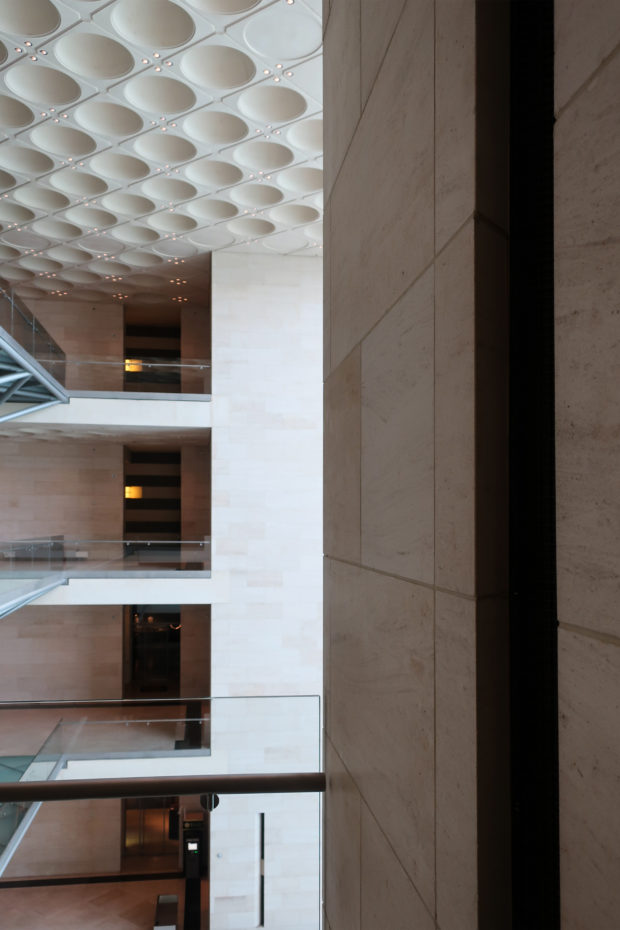 The building was constructed with noble materials, such as cream-colored limestone Magny and Chamesson from France covering the exterior facades, the Jet Mist granite from the United States and stainless steel from Germany, as well as the architectural concrete from Qatar.