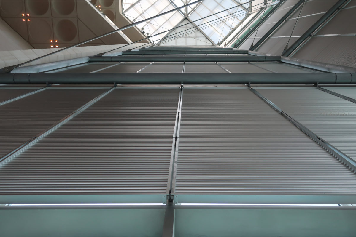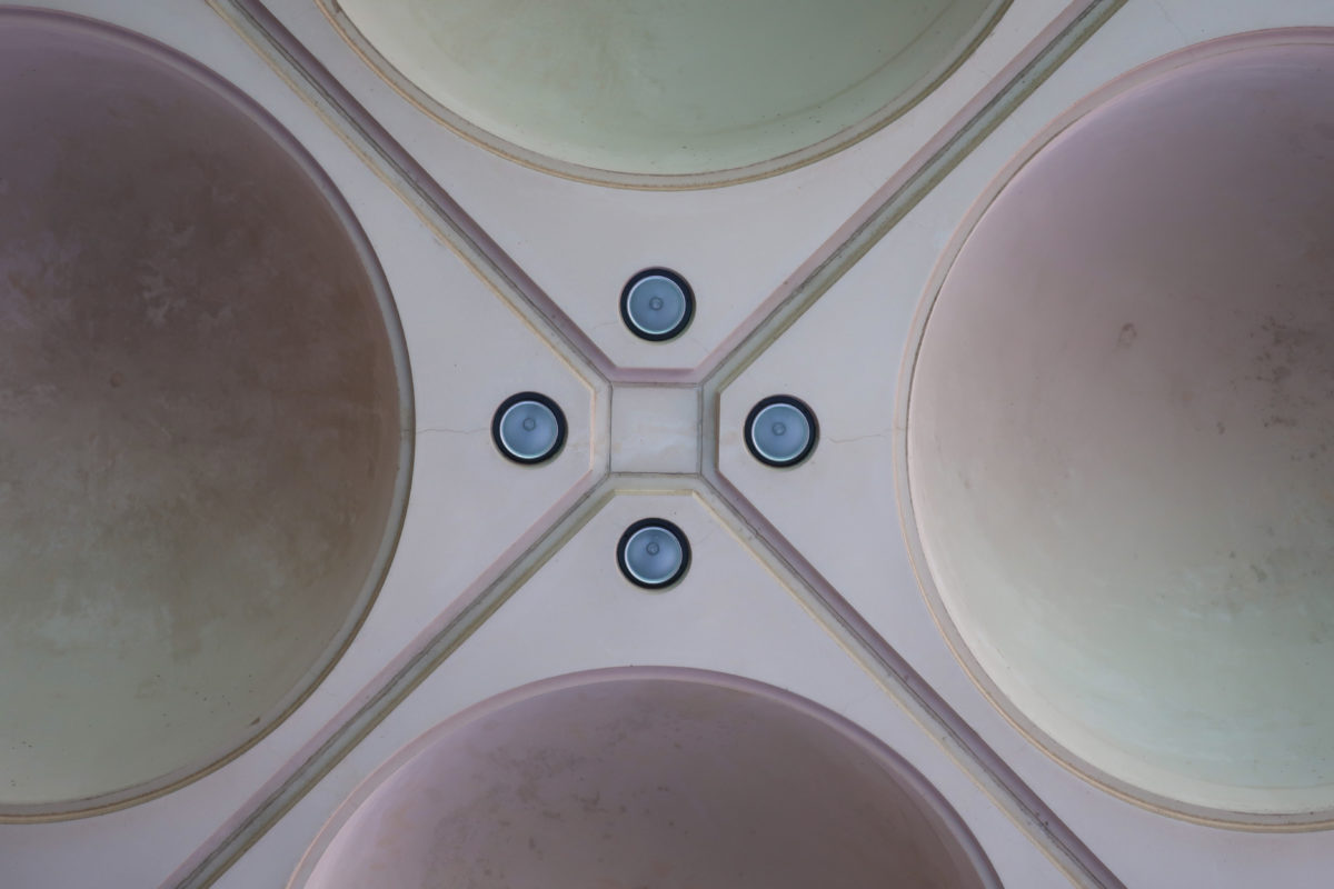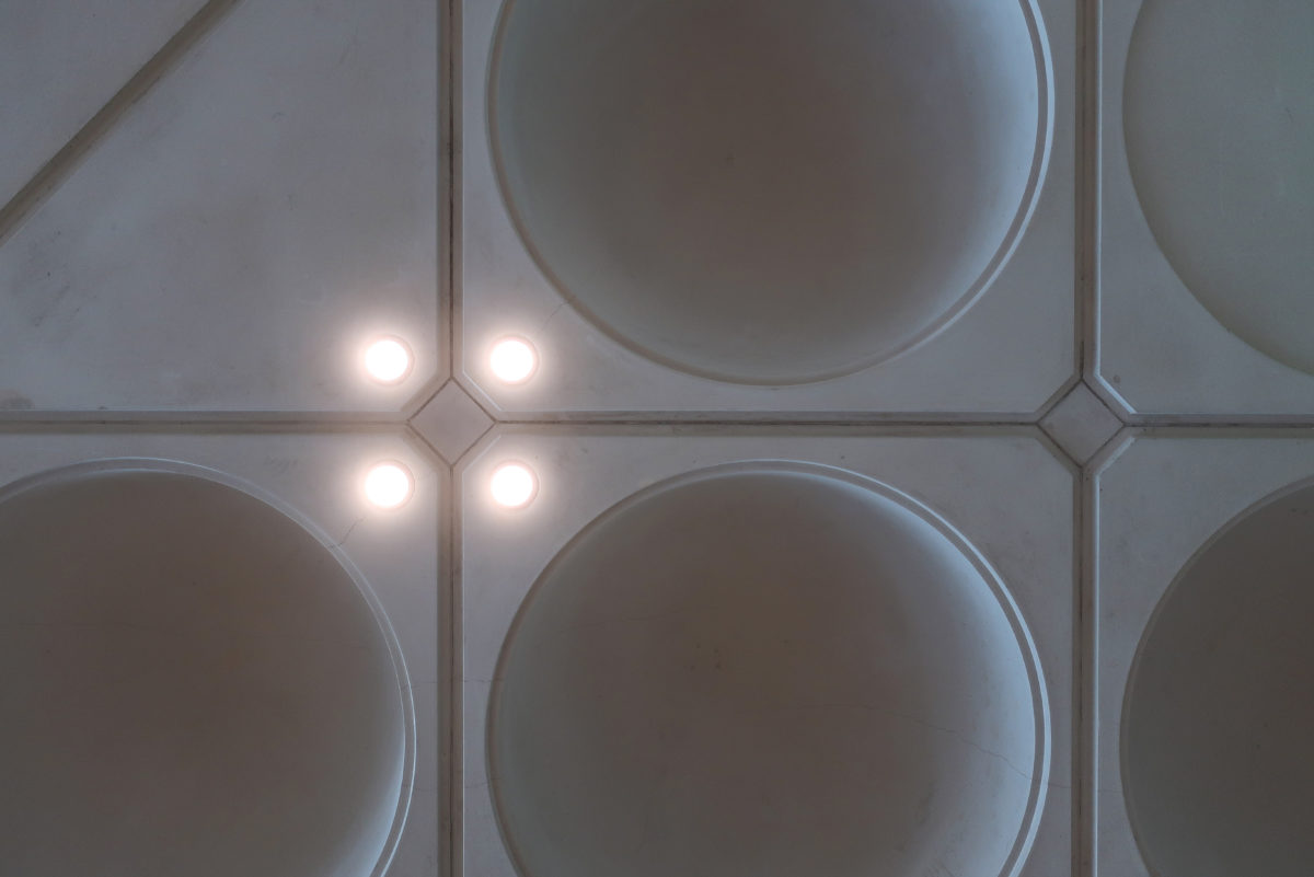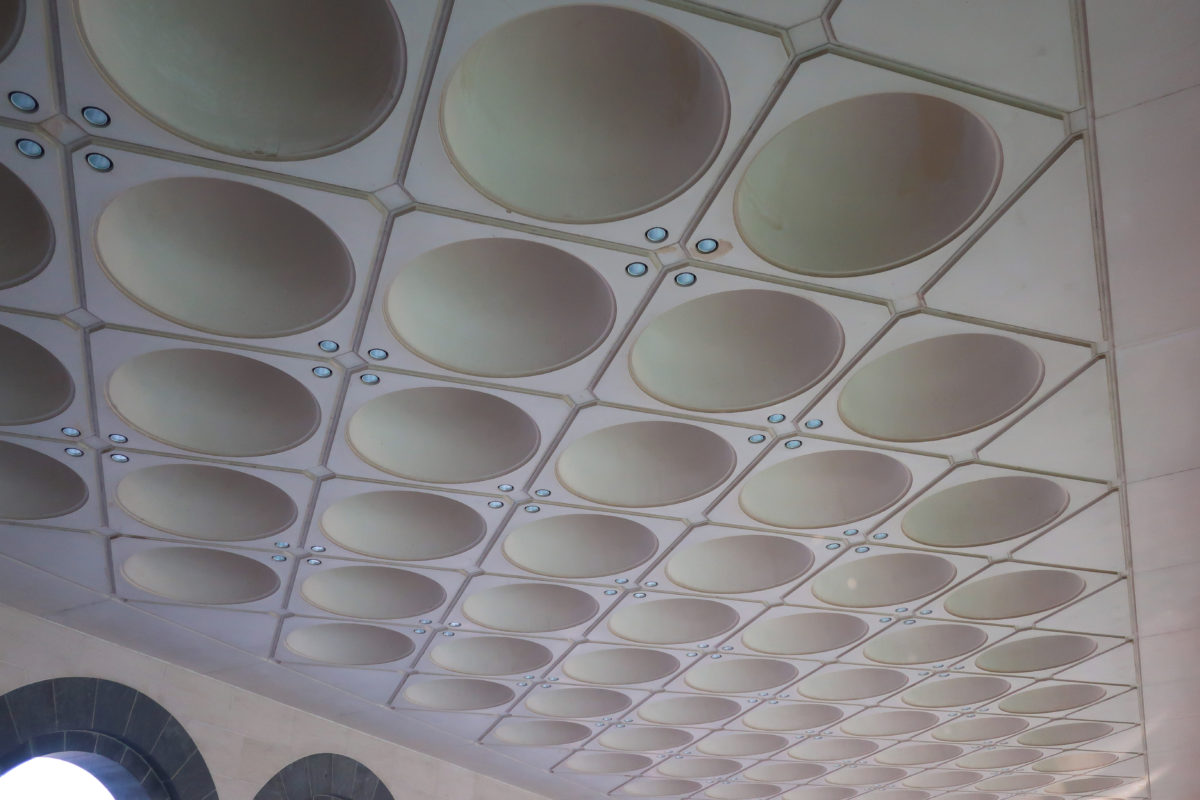The structural framework of the dome that illuminates the central space of the atrium was made of stainless steel. The ceilings are constructed with intricate pieces of architectural concrete in the form of small domes embedded in the place and finished with individual molds.