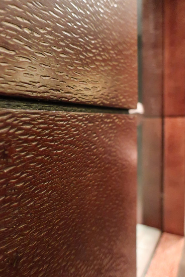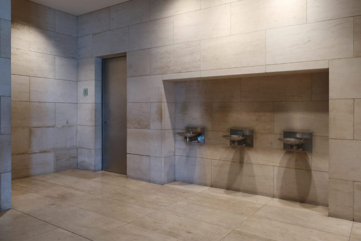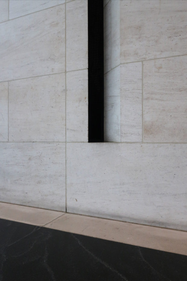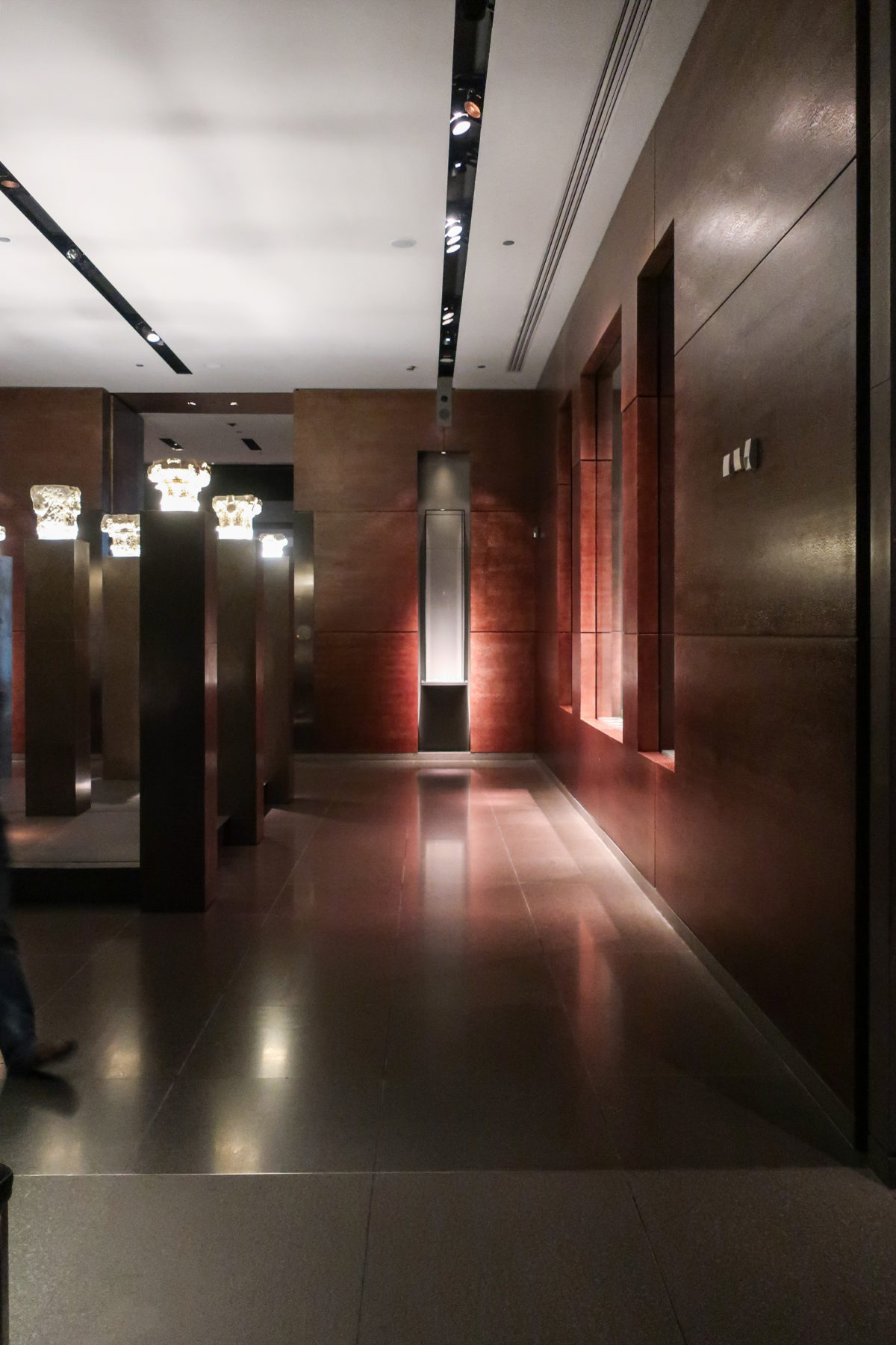 The galleries feature dark gray porphyry stone and Louro Faya, a Brazilian lace wood that was brushed and treated to create a metallic appearance, which contrasts with the light-colored stone from the rest of the Museum. To protect the fragile antiques on display, the rooms have specially designed cases and lighting. Wilmotte also created custom furniture for the museum, inspired by Pei’s architectural style.