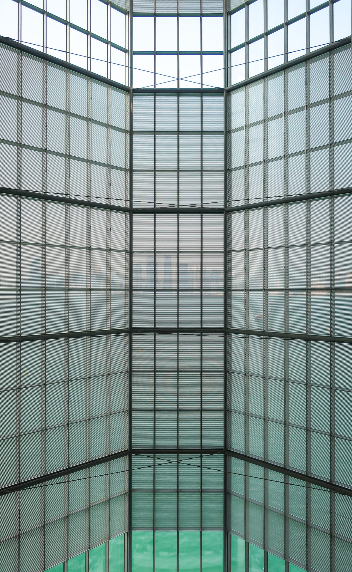 A geometric matrix transforms the descent of the dome from a circle to an octagon, to a square and finally to four triangular fins, which lean at different heights to become the columns of the atrium.