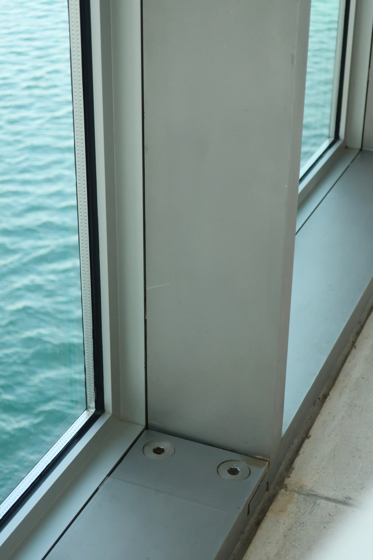 The large glazed wall facing the Gulf is protected from the sun and outside noises by means of a damping screen made of aluminum acoustic bars.