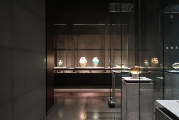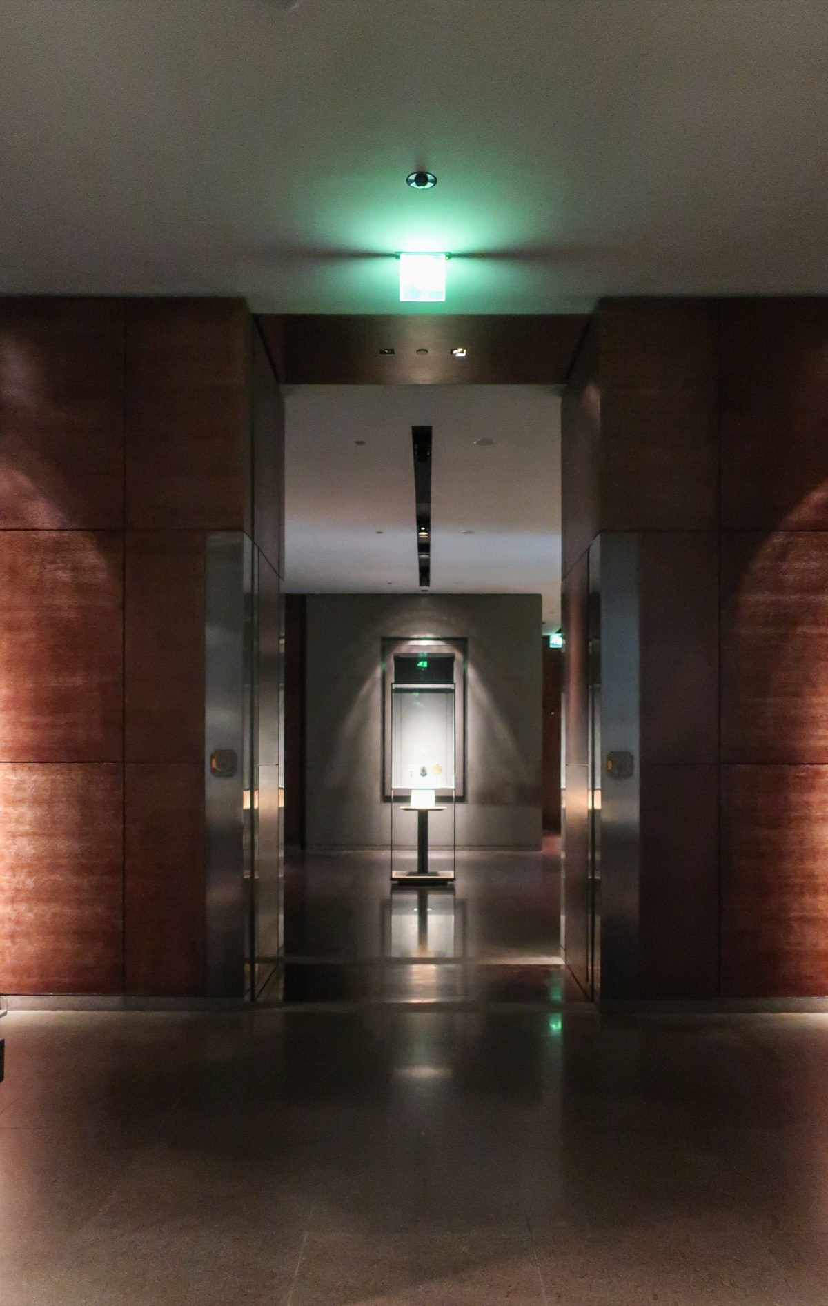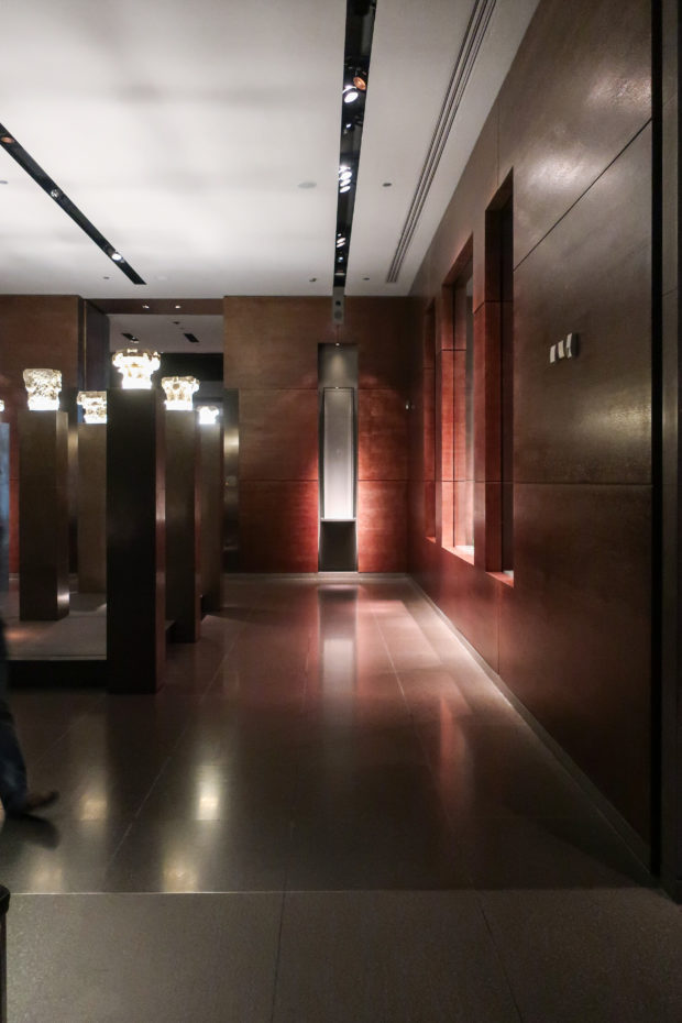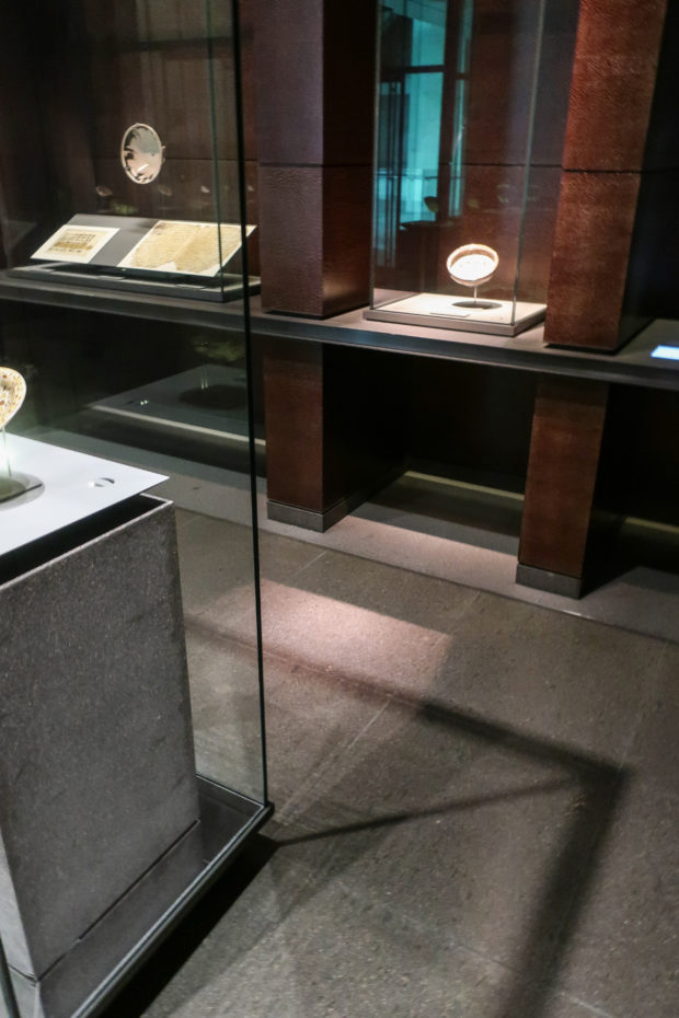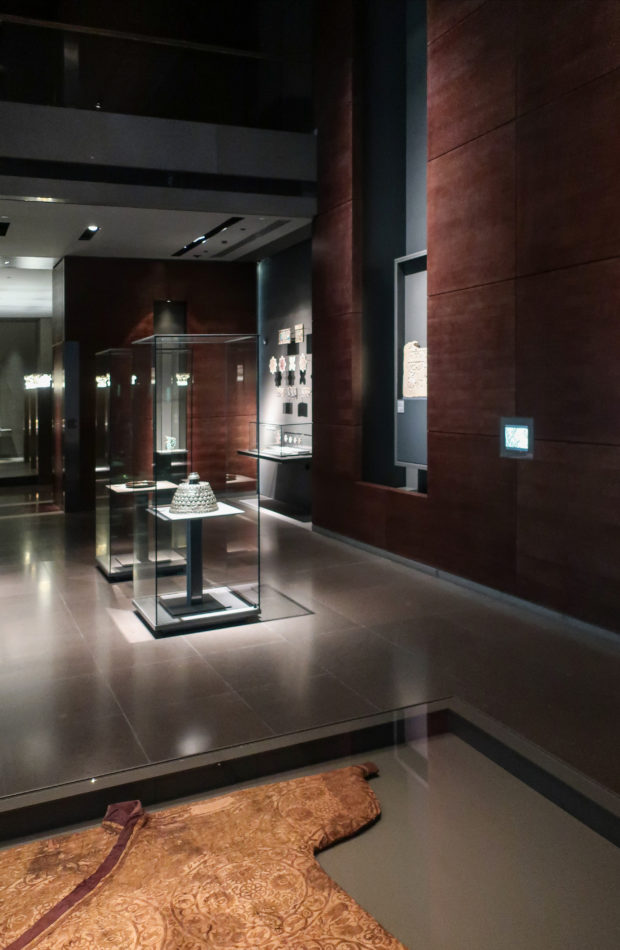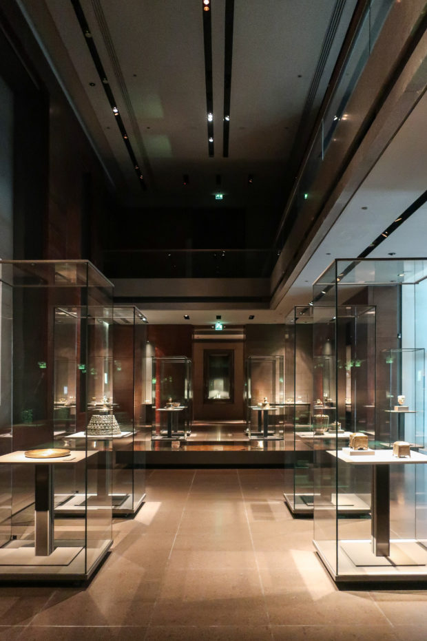 Pei provided the museum with a series of galleries with geometric arrangements that were essentially “black boxes” and put in the hands of the French designer Wilmotte to turn them into vibrant spaces where to exhibit Islamic decorative arts. The designer played with a subtle range of high quality dark materials that highlight the exposed piece making it the protagonist, despite the huge glass doors in the showcases, operated only by a button, or the dark-carved gray stones that line the walls , all wrapped by a suggestive and intimate light.