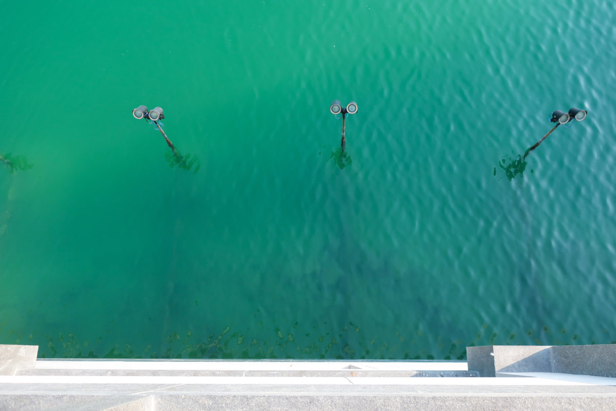 With steps on both sides, the apex of the main building is dotted with a short tower with an eye-shaped opening that masks an inner dome. From certain angles, the structure has a flat and chimeric quality, as a scenario, from others, seems to be floating on the surface of the water.