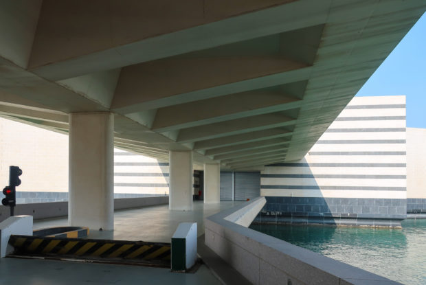 The museum, which consists of two buildings, the main one with 5 floors and 4,225 m² of exhibition space and the 2-story educational wing connected to the first one through a central courtyard, is connected to the coast by two pedestrian bridges and a vehicular bridge . Two 30.50m high lanterns mark the boat dock on the west side of the Museum, creating a large entrance for guests arriving by boat.
