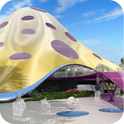 The three-dimensional object minimizes the voilume used. The building is covered by a pyramidal skin envelope of undulating and morbid forms, with a widened base and rounded edges giving impressions of octopus, mushrooms or jellyfish.