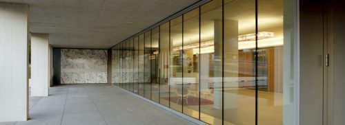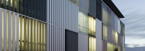 On three sides, the building is presented as a concrete monolith, while its main facade, facing the road, is radically different. This side wall is composed entirely of glass protected by a series of mobile vertical visors aluminum and glass.
