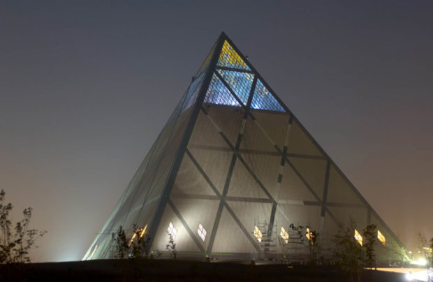 The pyramid was a symbolic form suitable for this project and that no religion (after the Egyptian) had adopted as its own symbol, and therefore a large number of religions would be willing to accept this form of the building and not offend anyone itself.