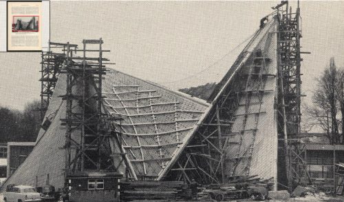 The panels were built in a shed by a simple sand mold following the game of flag curvature. Once the panels were extracted from the mold, were numbered and shipped to the construction site to be quickly assembled, hanging them on the steel cables embedded in concrete ribs thin specially constructed for this purpose. The result was a building built quickly and efficiently to meet all both visually and acoustically requirements.