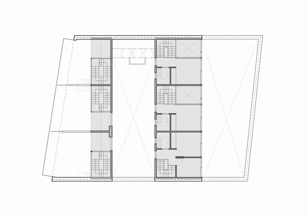 A sequence of galleries, half covered walkways and vertical circulations are combined in a game organized by the visual space, calibrating the road privacy.