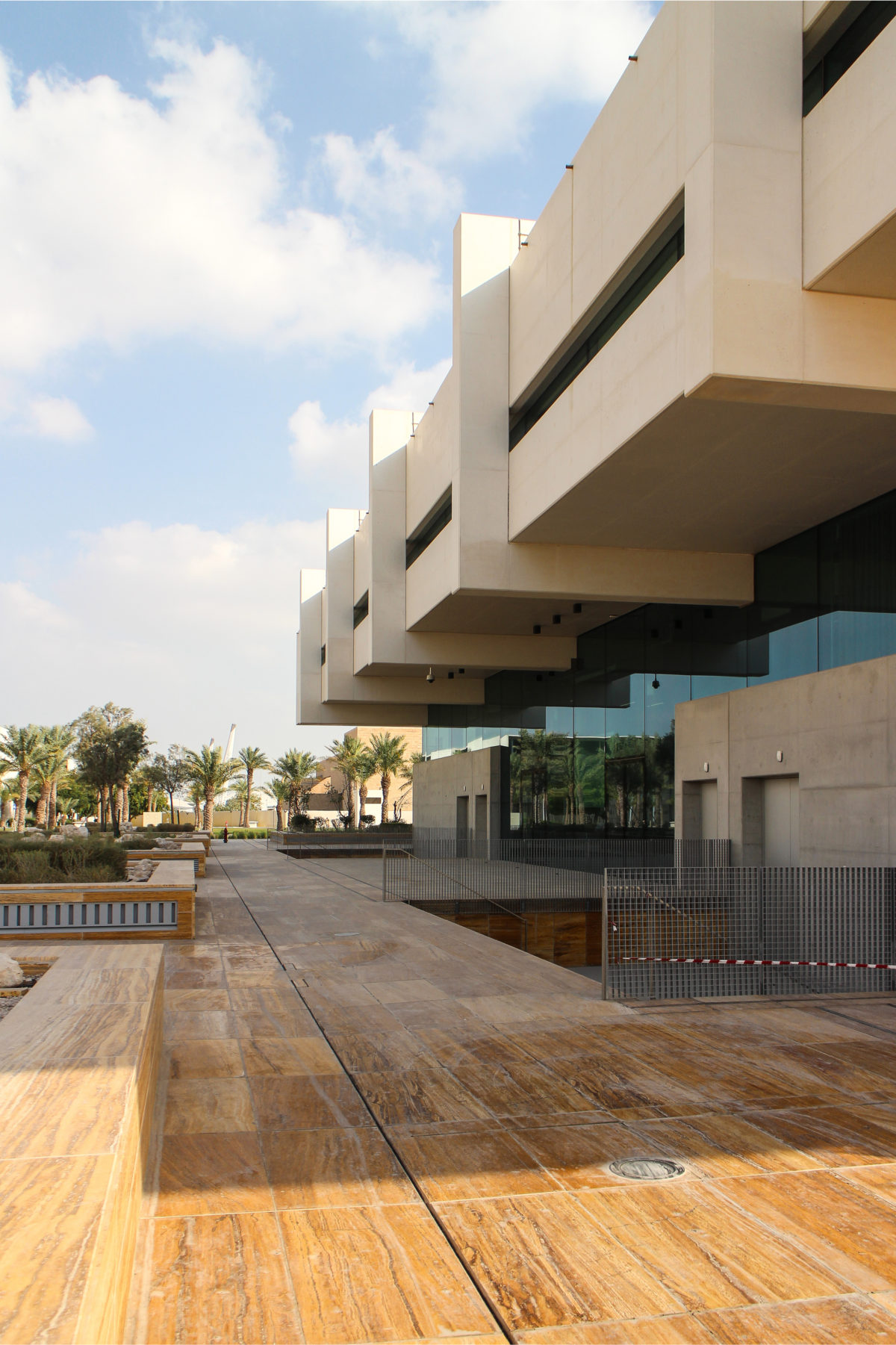 Built from a mixture of classic and white concrete, the Center for Strategic Studies, consisting of 3 floors, has a gross surface area of 5,661 m2. The project participates in the basement that covers an area of 37,500 m2 where the parking is located. The Center has two entrances, one at ground level facing the main building of the Qatar Foundation and the other on the opposite side, through wide stairs or a ramp limited by concrete walls seen with steel railings. Its construction was completed in 2015.