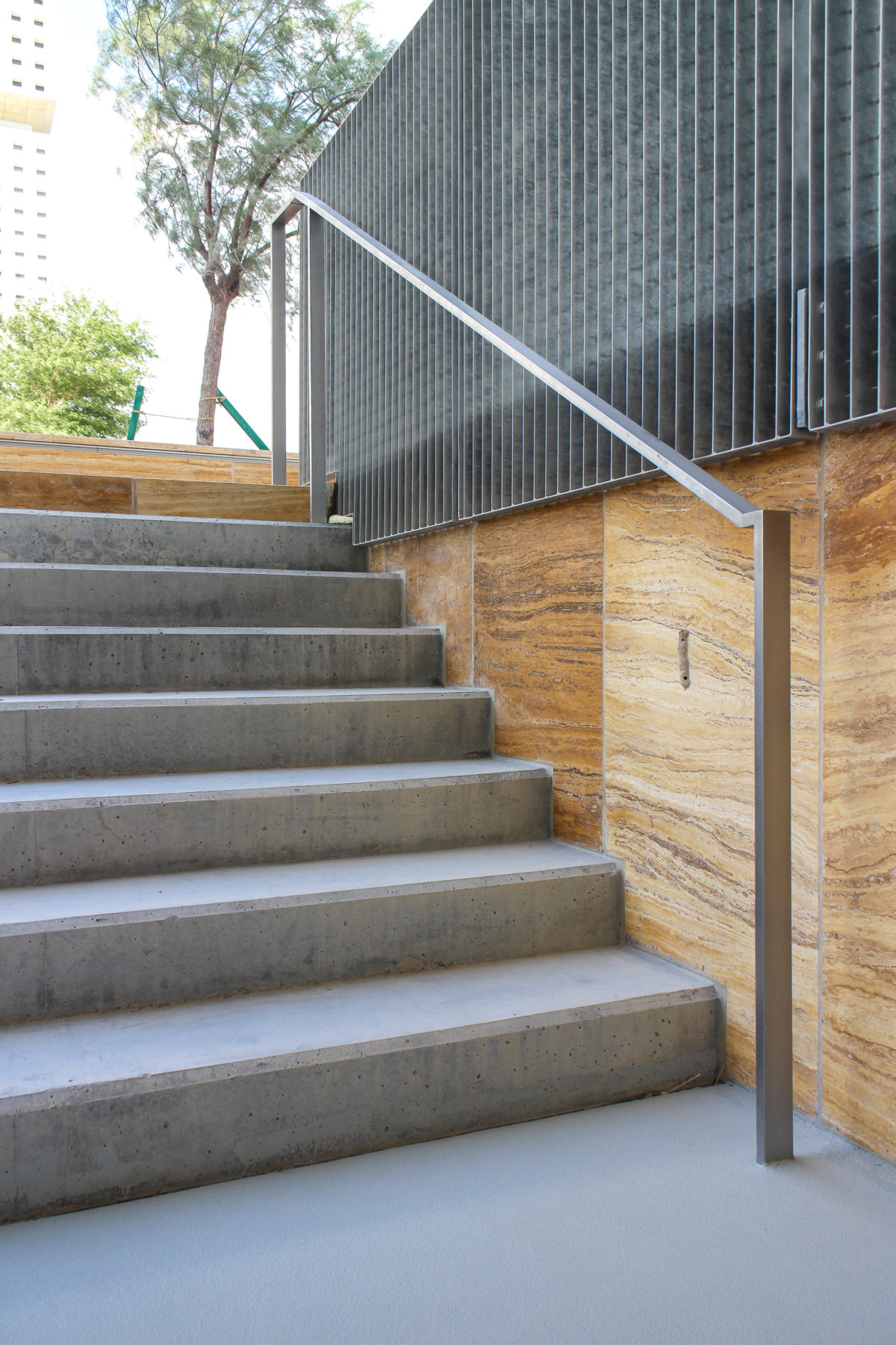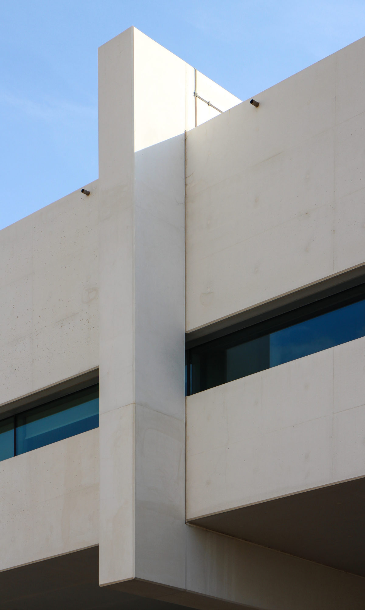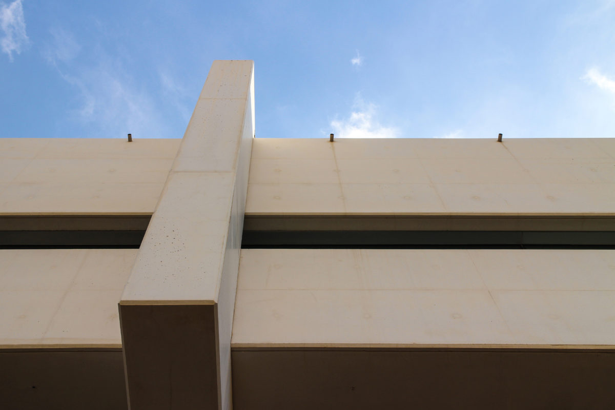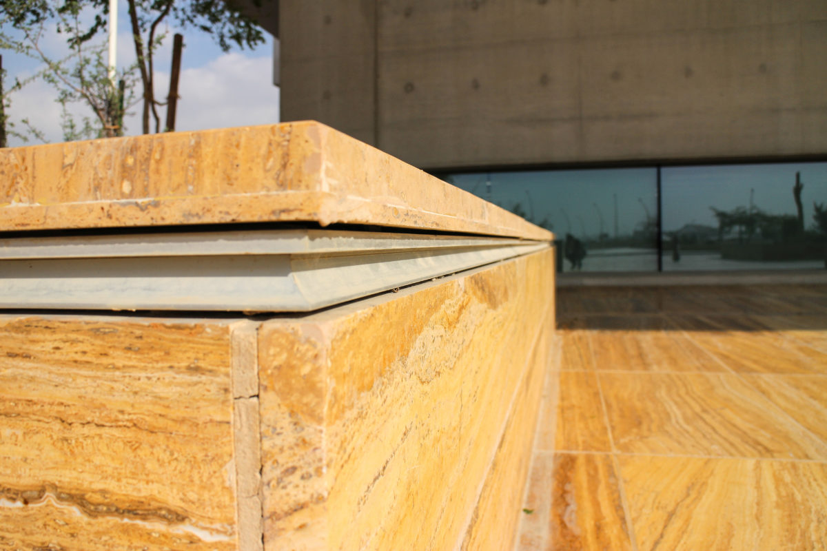 In the completion of the exterior facades of the Center for Strategic Studies, the combination of gray concrete and white concrete was used, with sectors covered with beige veined marble slabs, material that predominates throughout the extension of the Foundation’s gardens.