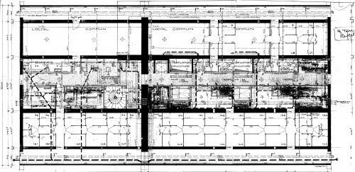 This corridor has been designed as a ” covered street ” in the spirit of the Unites d’Habitations of Le Corbusier. The connection between the different partitions is sometimes extended to create “places” where the mailboxes are located and open spaces for public use, initially planned as places to park prams or bicycles neighbors. It was put into operation a collective laundry self-service which operated until the 1980s and a space for games. He had planned to install a nursery that was never done and even developed plans for the installation of refrigerated water fountains. These streets also provide access to the basement and the communal area of garbage.