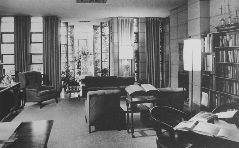 The house was built with concrete blocks, but unlike the houses made by Wright in Los Angeles using the same blocks, Richard Lloyd Jones House has large glass surfaces that give light and airy feel inside. Some of these large windows were mounted in steps, forming numerous rectangular windows with iron-framed glasses.