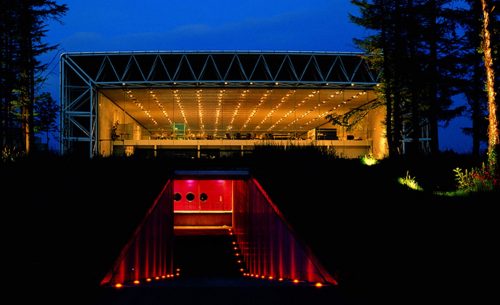 Full height windows in the front ends of the structure allowing the surrounding landscape form a backdrop to the exhibition areas and dining, while aluminum foil, light sensors linked to form an inside line to provide infinitely flexible system for control of natural and artificial resources.