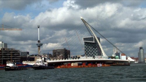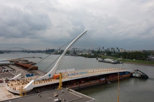 Construction started in Rotterdam in May 2007 and consisted of the union of eight steel sections to form the platform of 124 meters joined by straps and the mast. This structure was moved 628 miles by barge from the Netherlands steelworks. The weeklong journey through the English Channel and the Irish Sea. On arrival, the structure was secured in a reinforced pier built on the river Liffey and abutments located behind the walls of the existing piers.