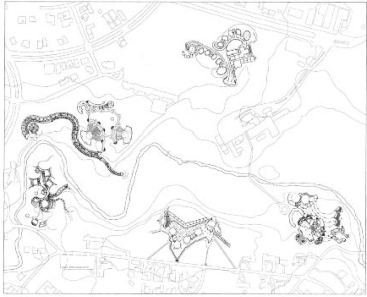 Initially, the three architects had total freedom and independence in budgetary decisions design. It was they who decided the location of each of the five buildings that make up, and those among them who decided to pursue in detail each of the buildings (only three were completed and were used in part).