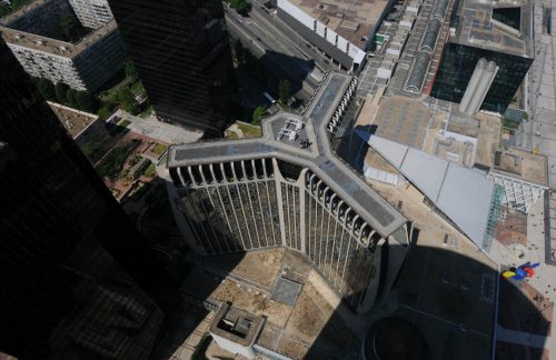 The PB5 office tower is located in the square, between the EDF Tower and the “Elysées Défense” building, which is located above the center “Les Quatre Temps” on the east side.